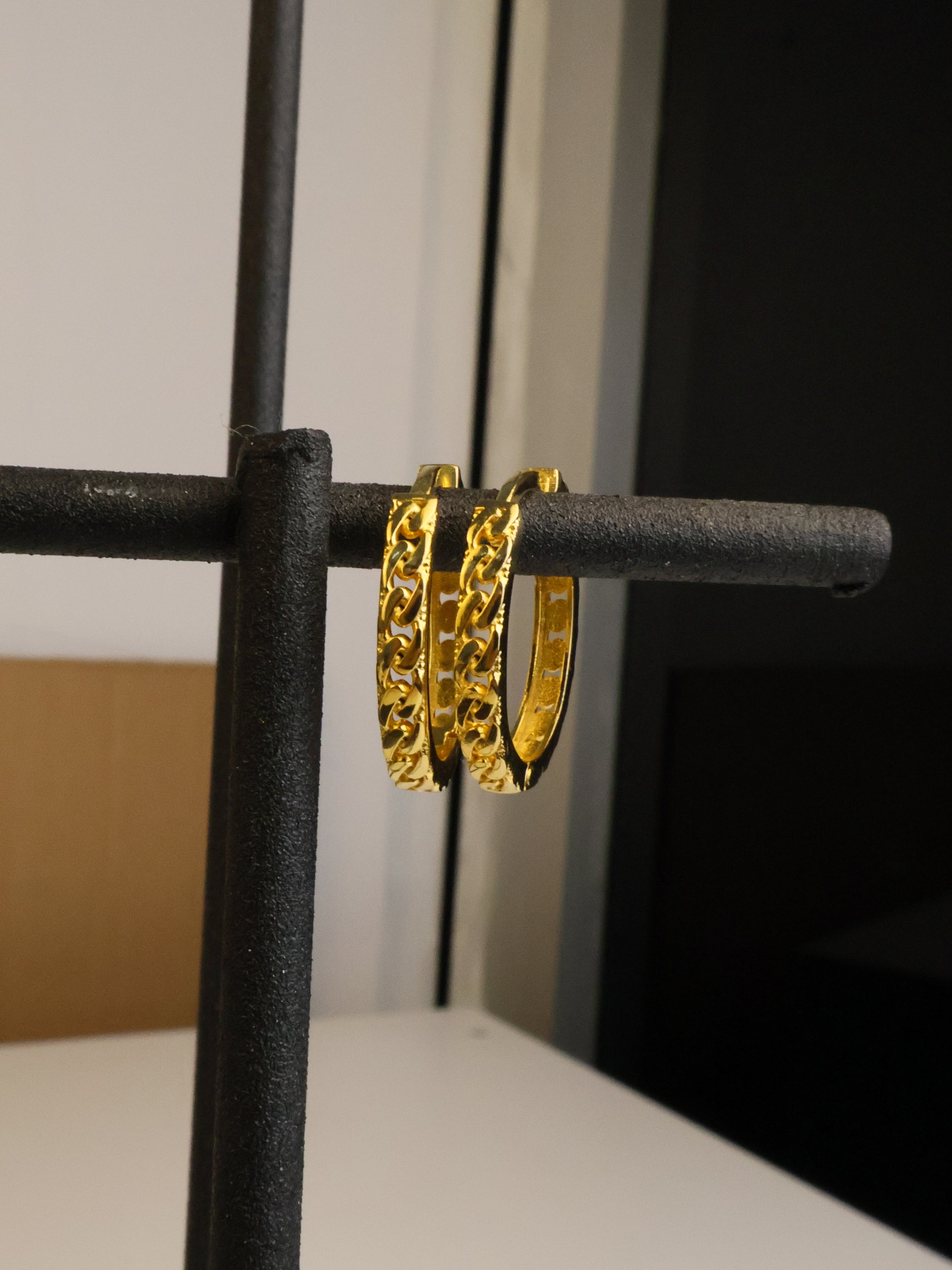 Zincir halka küpe, 22 ayar altın kaplama ve el işçiliği ile özenle tasarlanmıştır. Zincir detayı, günlük kullanımda ve özel günlerde stilinize modern ve zarif bir dokunuş katar.
