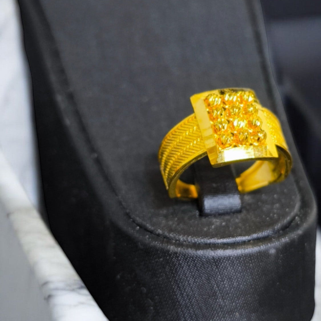 Modern geometrik tasarım ile geleneksel hasır işçiliğini birleştiren bu yüzük, el işçiliği ve kuyumcu işçiliği ile özenle hazırlanmıştır. Kare formundaki çerçevesi ve dorikalı detaylarıyla zarif bir stil sunarken, 22 ayar altın kaplama yüzeyi uzun ömürlü parlaklığını korur.
