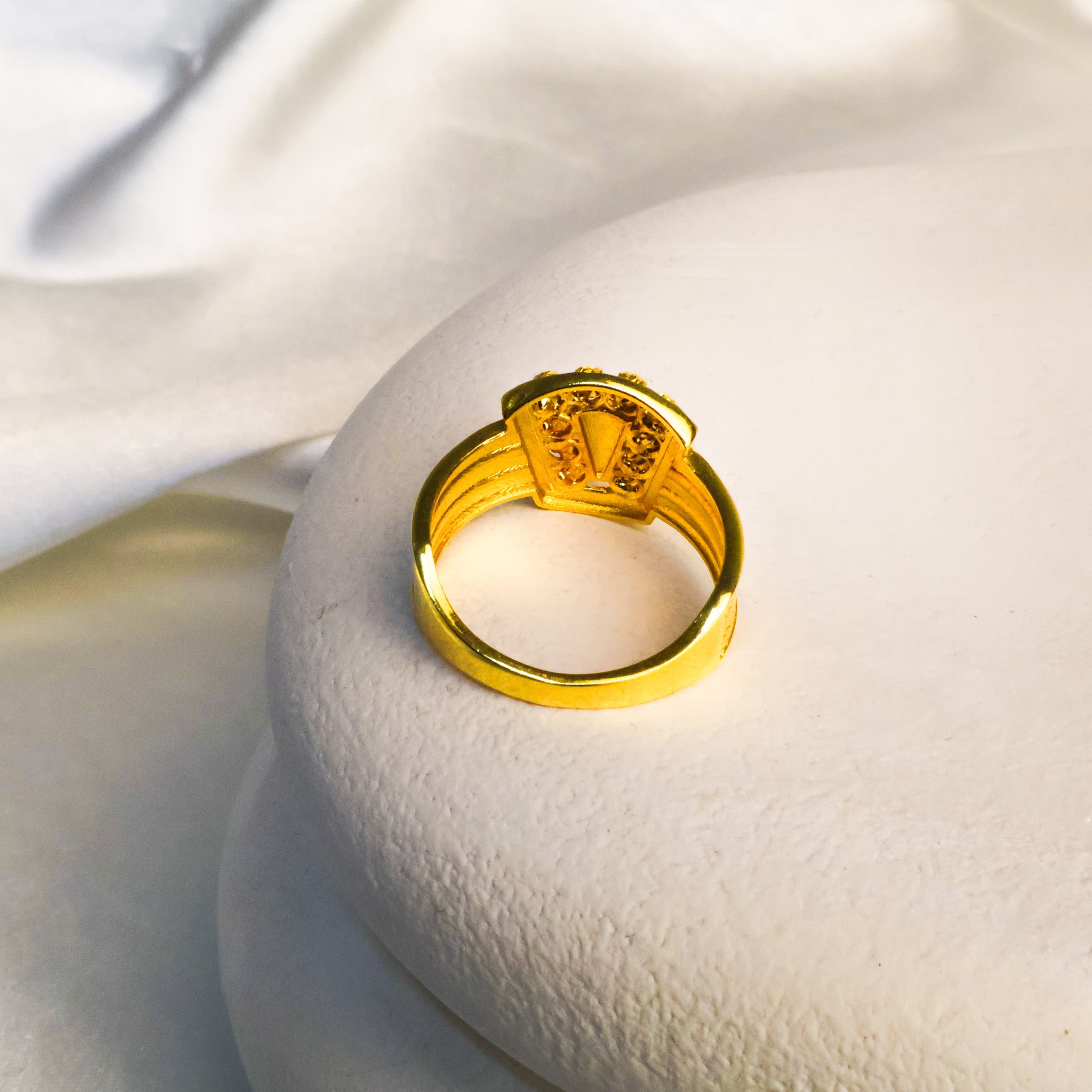 Zamansız şıklığı modern detaylarla buluşturan bu yüzük, el işçiliği ve kuyumcu işçiliği ile özenle hazırlanmıştır. Çerçeve formundaki tasarım ve dorikalı hasır detaylarıyla göz alıcı bir stil sunar. 22 ayar altın kaplama yüzeyi, uzun yıllar parlaklığını korur ve her kombinle uyum sağlar.