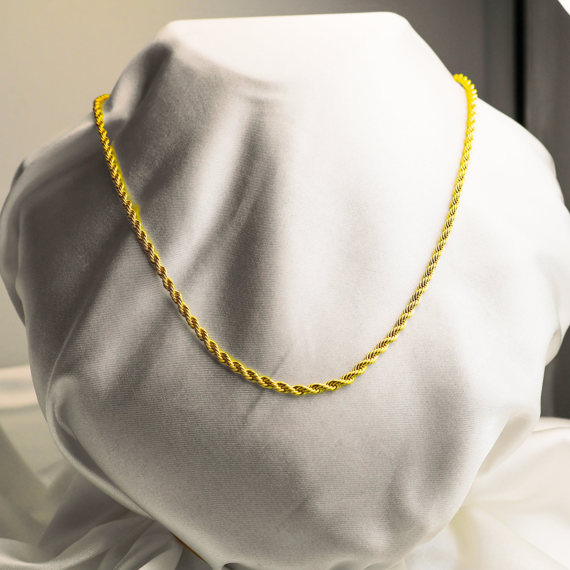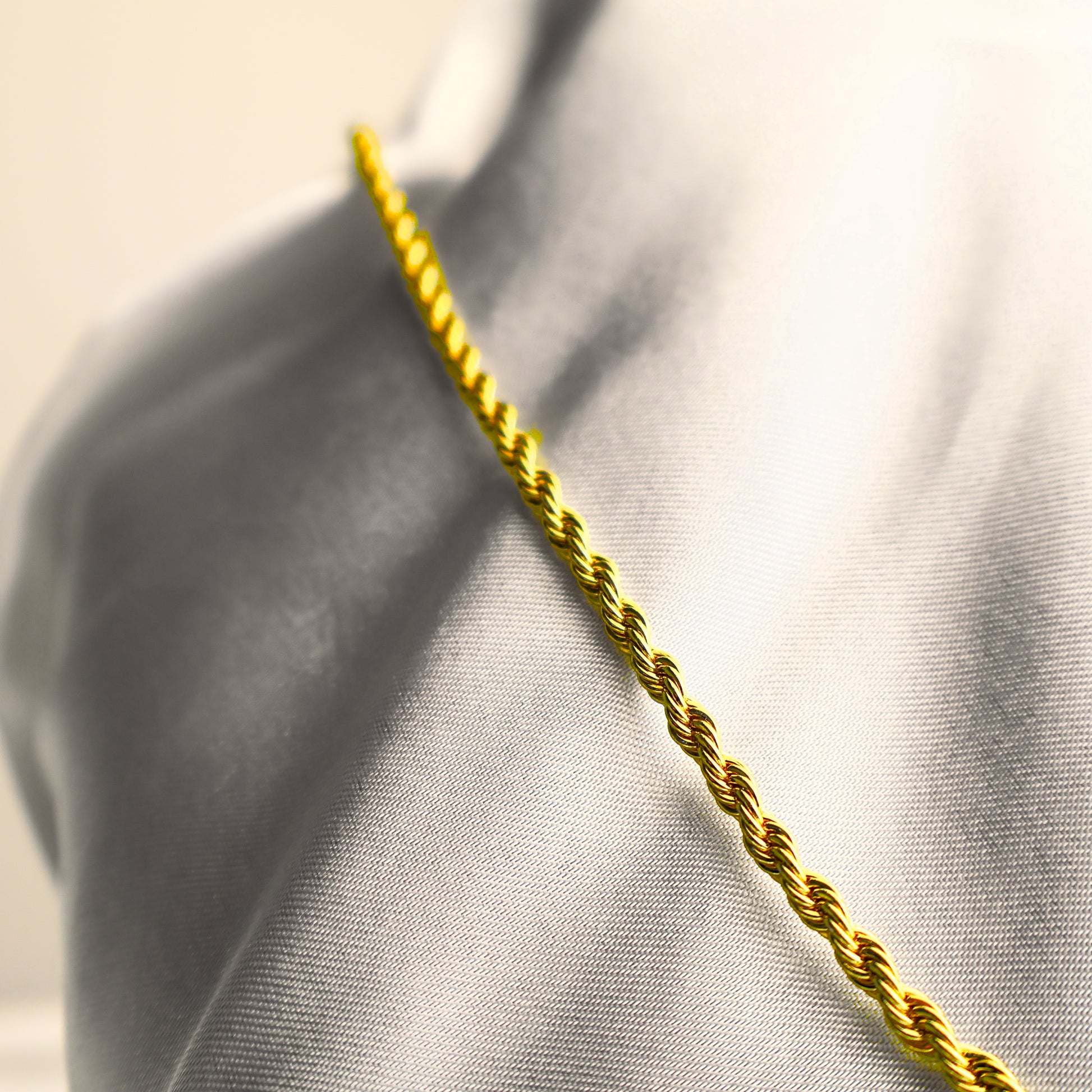 4 mm 22 Ayar Altın Kaplama Halat Zincir, güçlü görünümü ve zarif dokusuyla hem günlük kullanıma hem de özel gün kombinlerine mükemmel uyum sağlayan klasik bir tasarımdır. Örgü halat formu sayesinde ışığı her açıdan yakalayarak boyunda dikkat çekici bir parlaklık oluşturur.