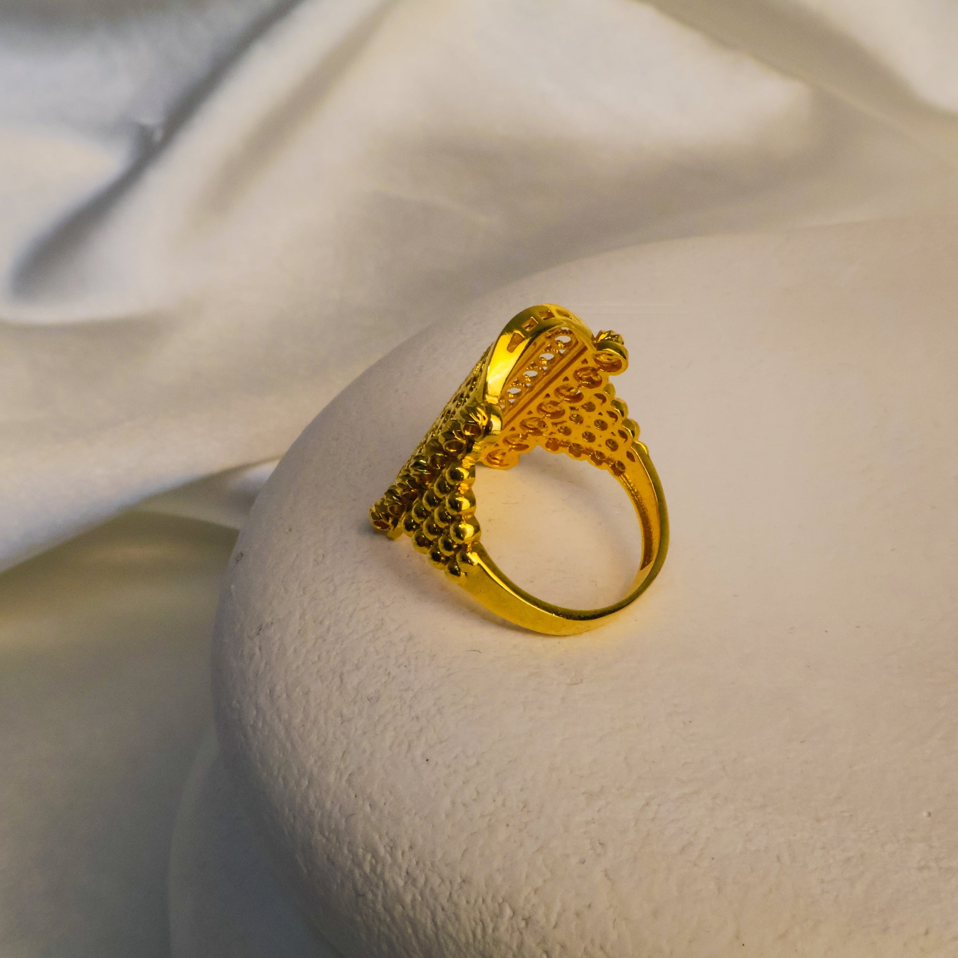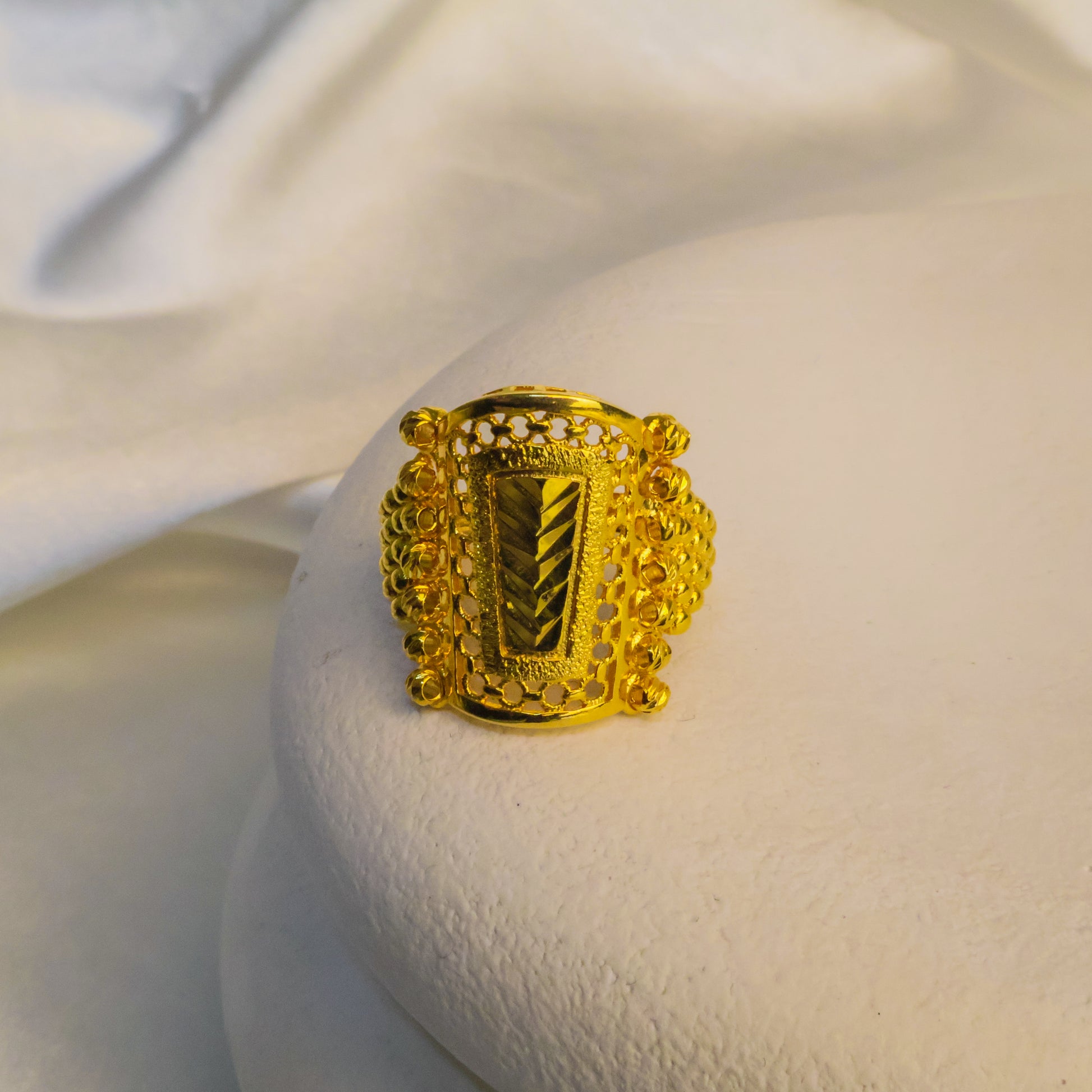 Klasik hasır dokusu ve zarif formuyla öne çıkan bu yüzük, el işçiliği ve kuyumcu işçiliği ile özenle hazırlanmıştır. Geleneksel hasır modeli, 22 ayar altın kaplamanın sıcak ışıltısıyla birleşerek her stile uyum sağlayan zamansız bir parça ortaya çıkarır.