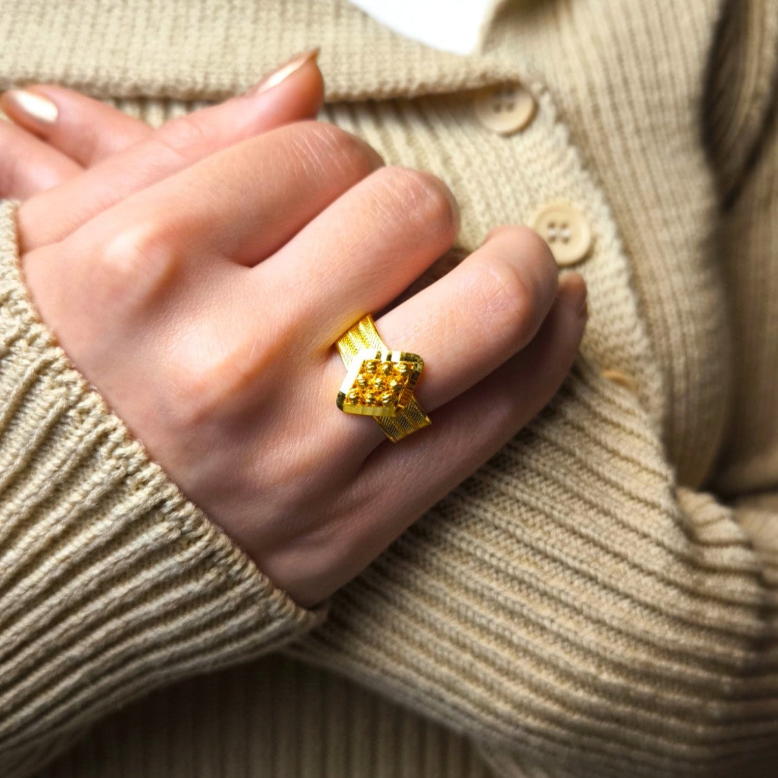 Geometrik tasarımıyla modern bir şıklık sunan bu yüzük, günlük kullanımda zarif bir tamamlayıcı olurken özel günlerde iddialı bir aksesuar olarak öne çıkar.