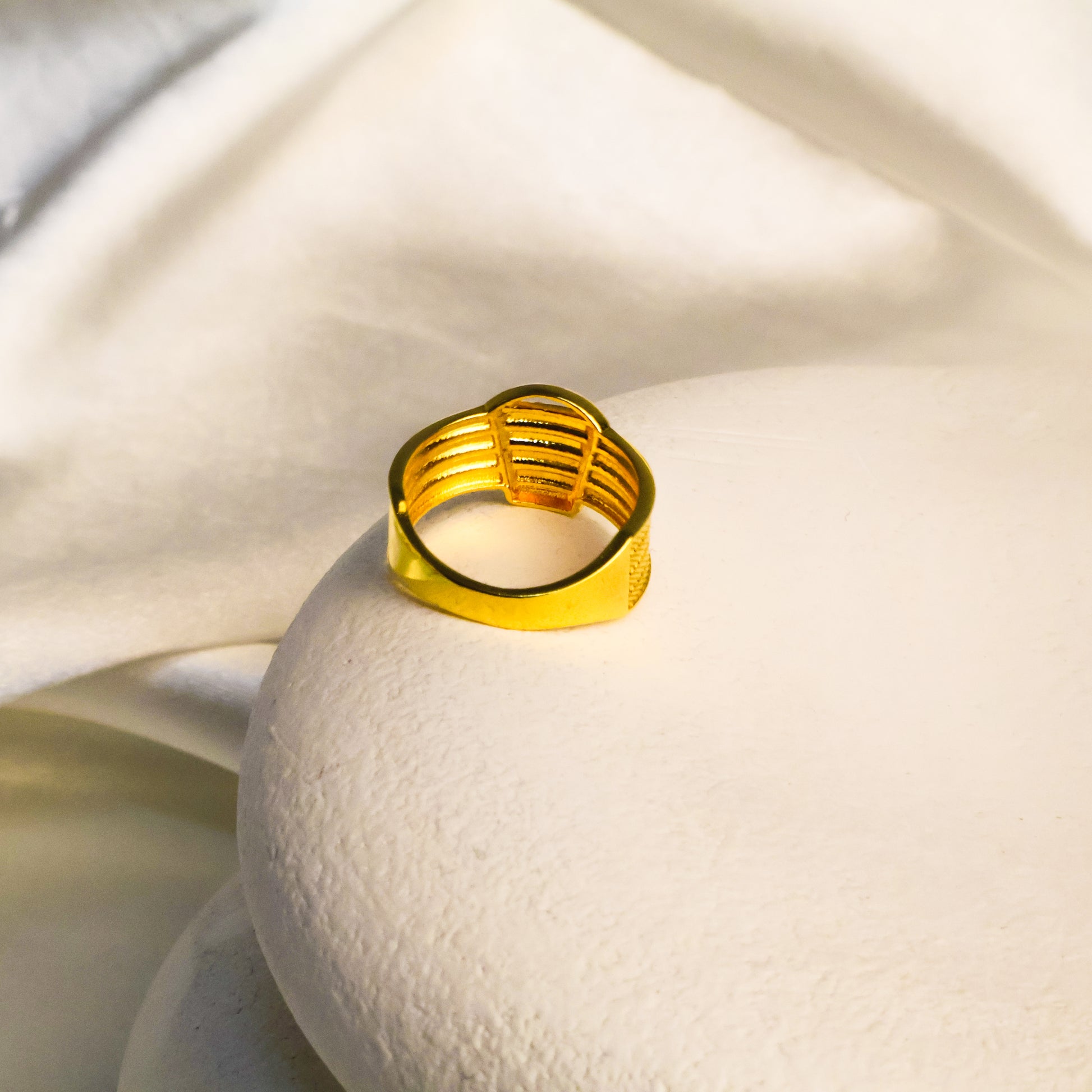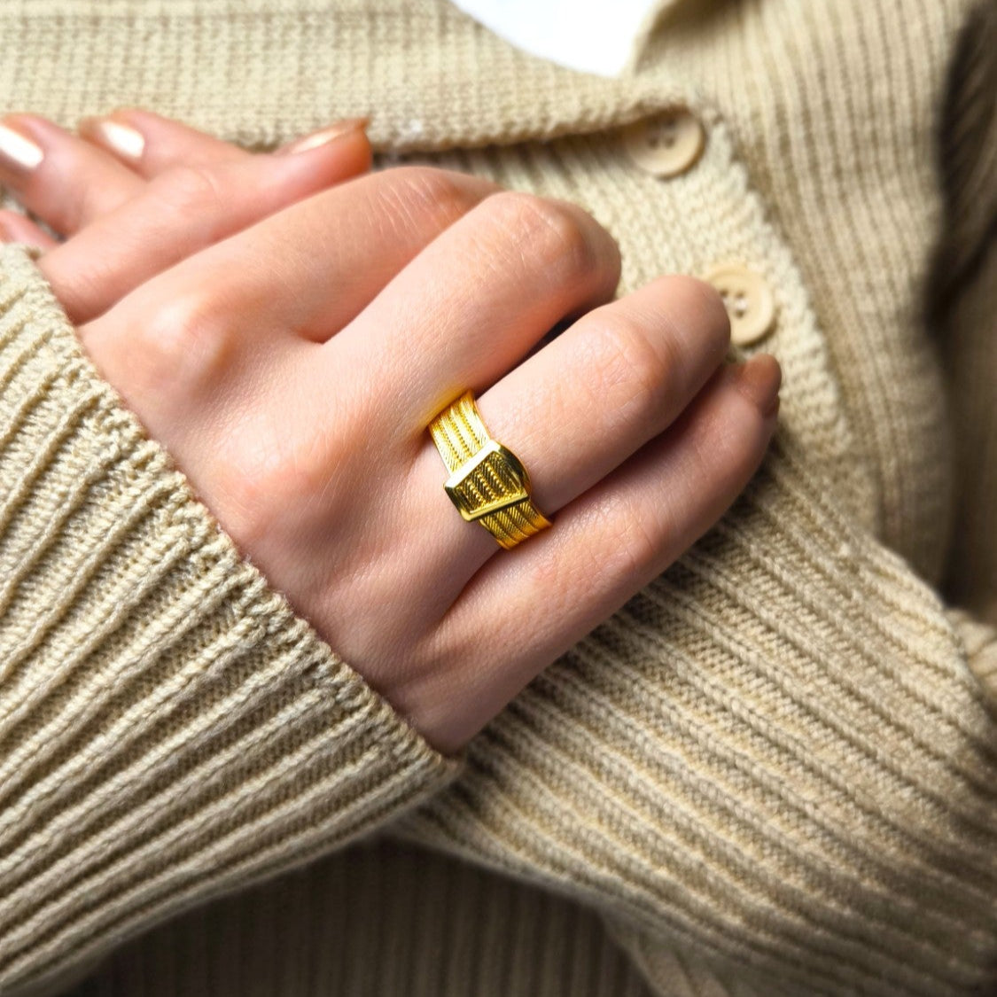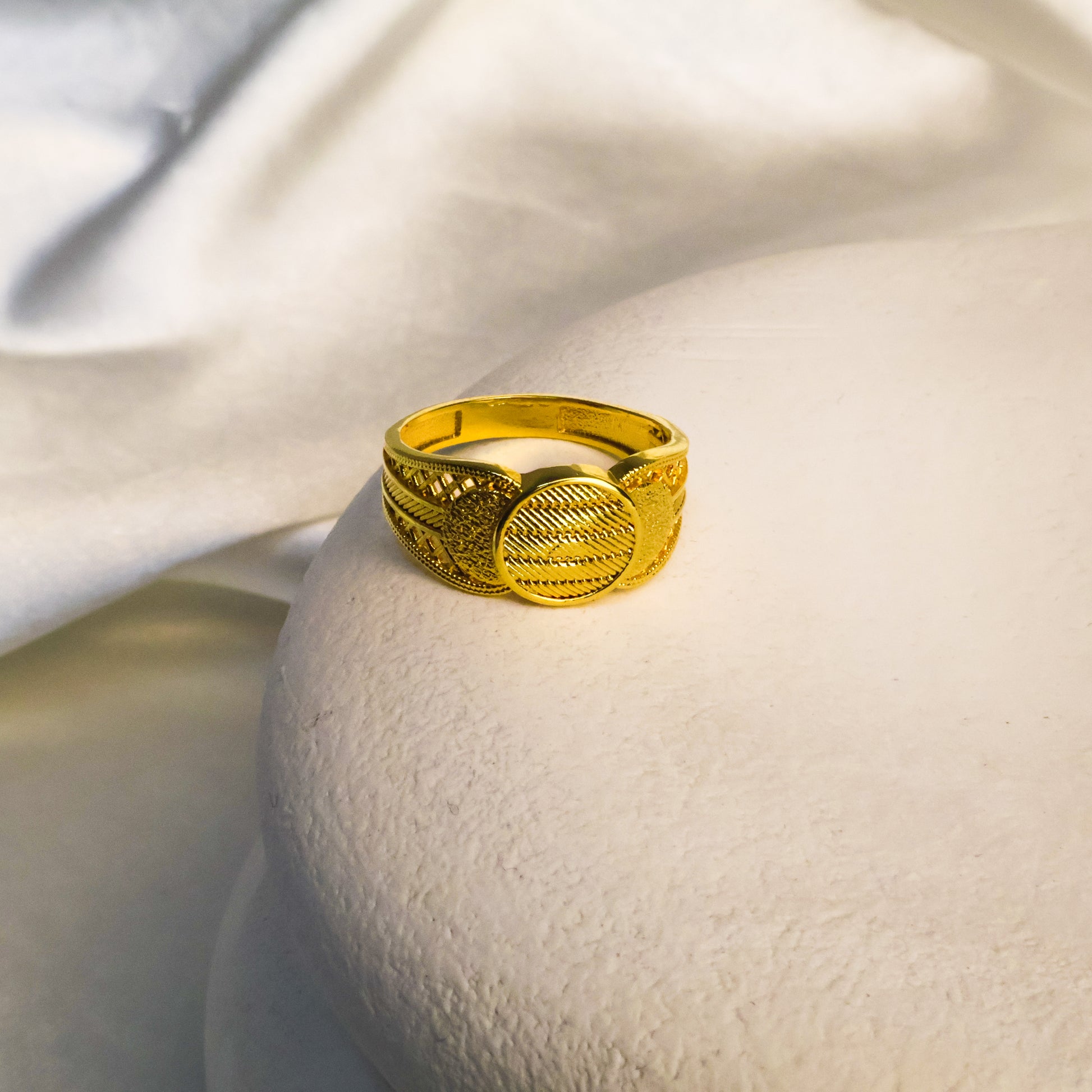 Klasik hasır tasarımın zarafetini parmağınıza taşıyan bu yüzük, el işçiliği ve kuyumcu işçiliği ile özenle üretilmiştir. 22 ayar altın kaplama yüzeyi, uzun ömürlü parlaklığıyla stilinize sofistike bir dokunuş ekler.