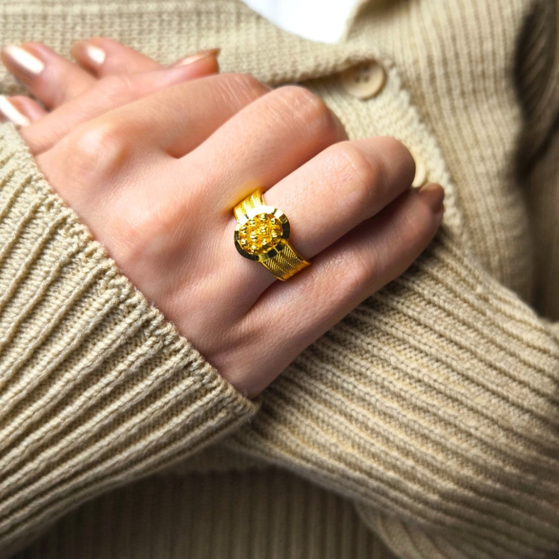 Klasik hasır işçiliğini modern oval çerçeve tasarımıyla birleştiren bu yüzük, el işçiliği ve kuyumcu işçiliği ile özenle üretilmiştir. Oval çerçeve formu ve dorikalı detaylarıyla zarif bir şıklık sunarken, 22 ayar altın kaplama yüzeyi uzun ömürlü parlaklığını korur.