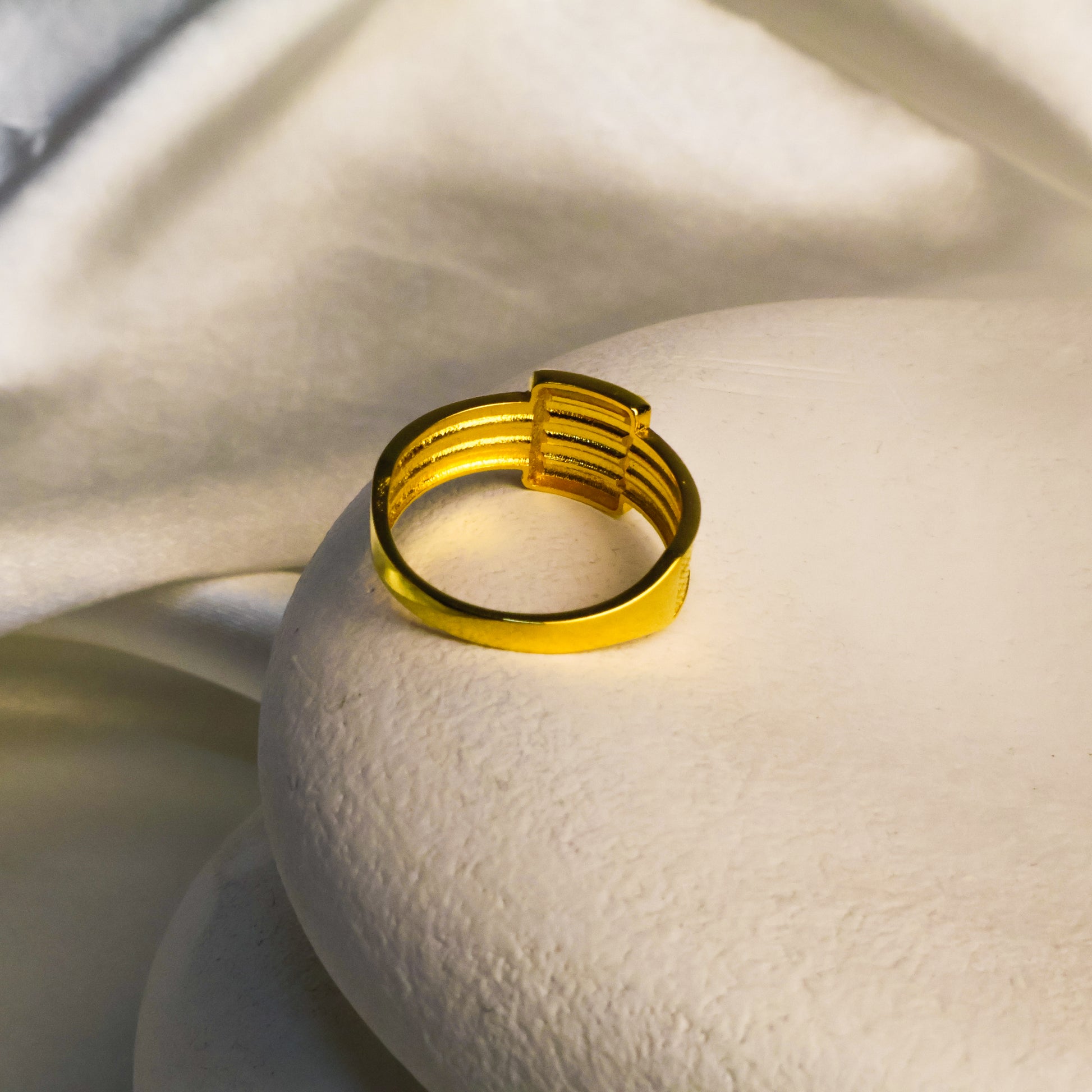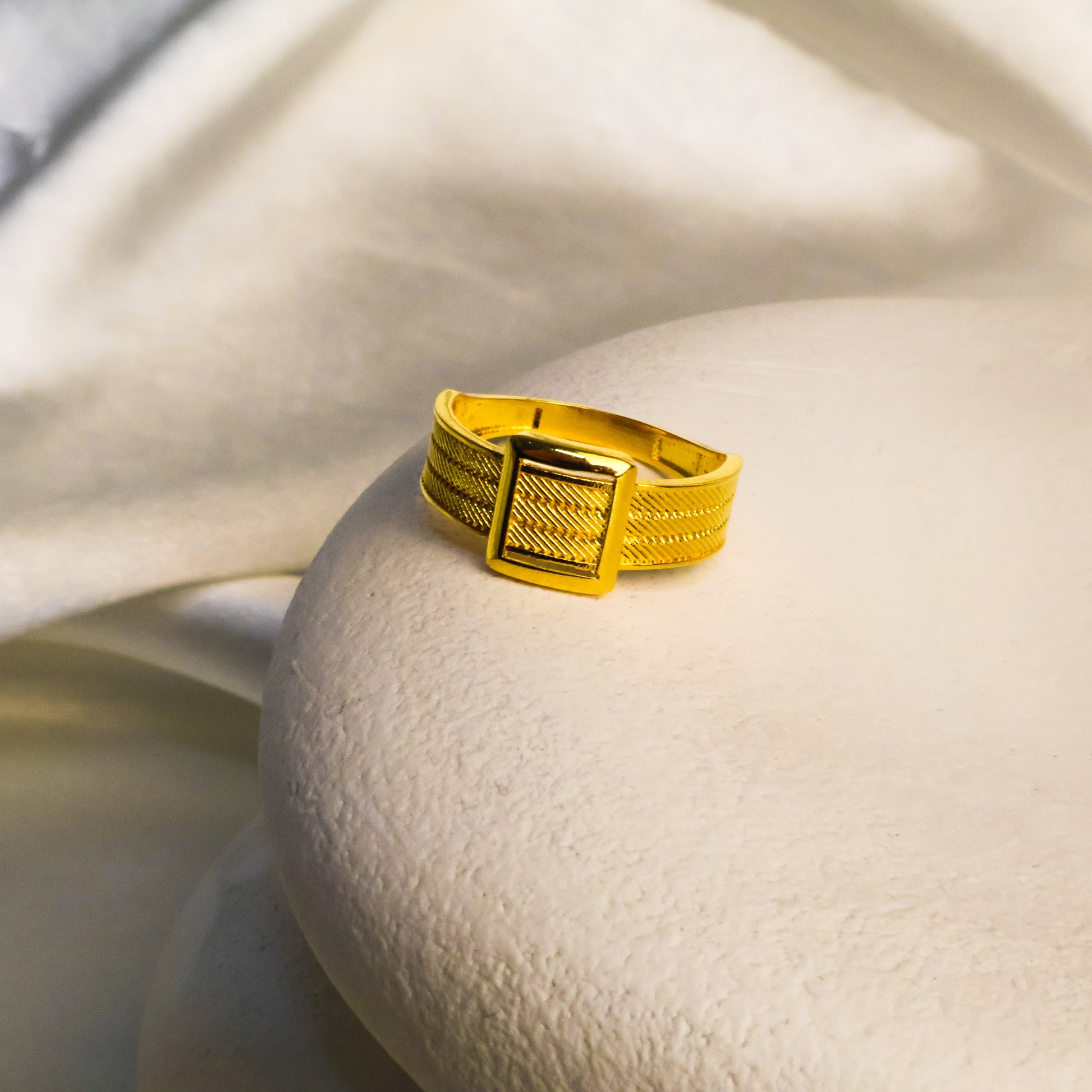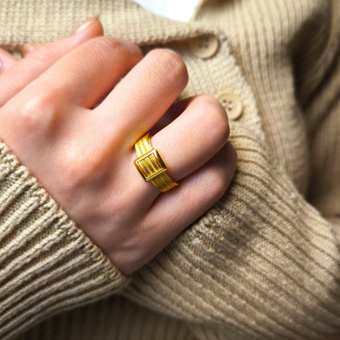 Modern geometrik tasarım ile klasik hasır işçiliğini buluşturan bu yüzük, el işçiliği ve kuyumcu işçiliği ile özenle hazırlanmıştır. Kare formundaki gövdesi ve hasır detaylarıyla zarif bir stil sunarken, 22 ayar altın kaplama yüzeyi uzun ömürlü parlaklığını korur.