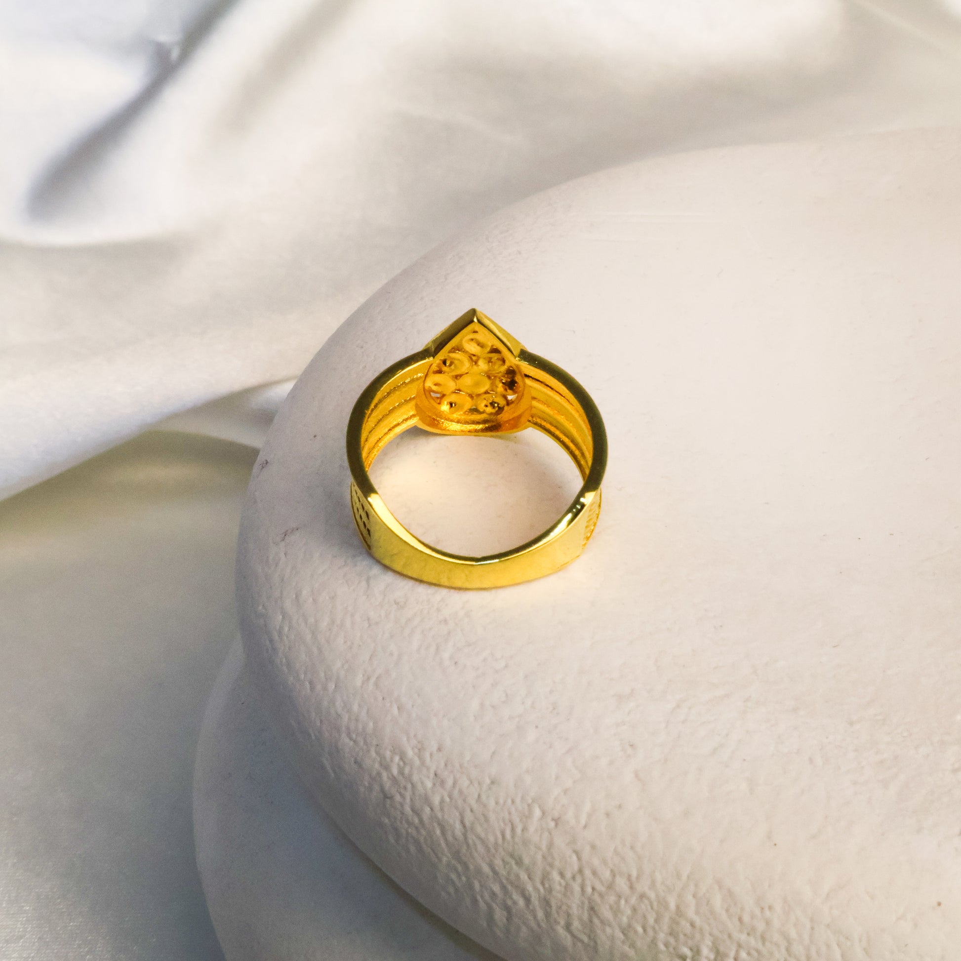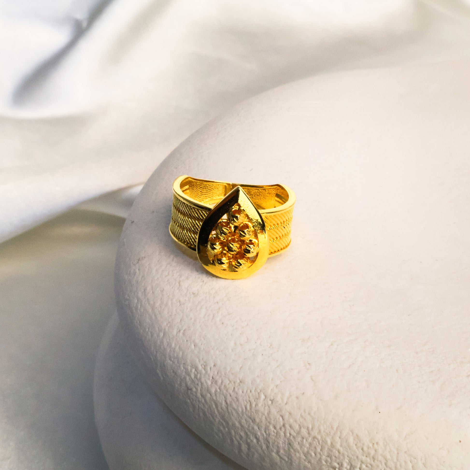 Zarif damla formu ile geleneksel hasır işçiliğini birleştiren bu yüzük, el işçiliği ve kuyumcu işçiliği ile özenle hazırlanmıştır. Damla çerçeve formu ve dorikalı detaylarıyla modern bir şıklık sunarken, 22 ayar altın kaplama yüzeyi uzun ömürlü parlaklığını korur.