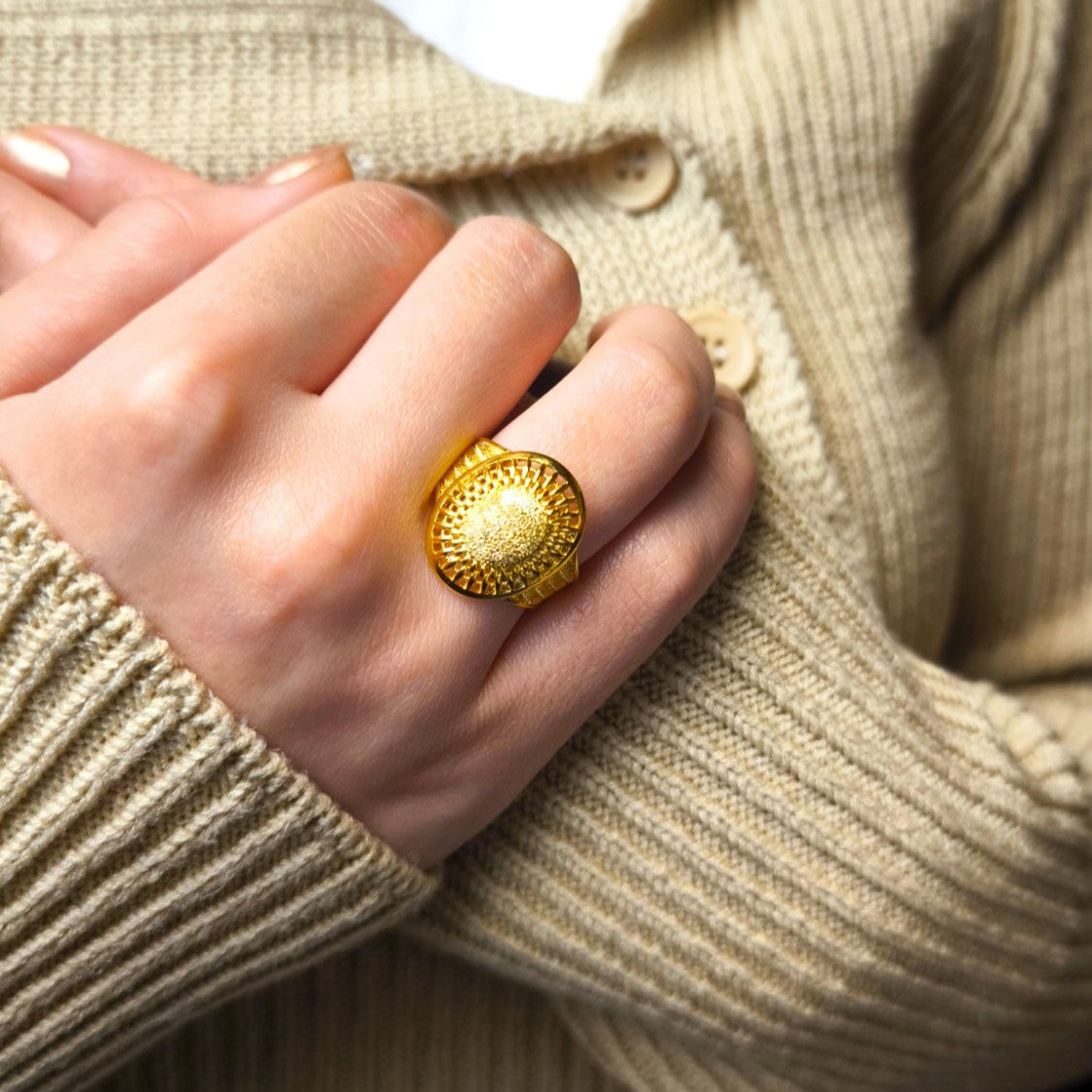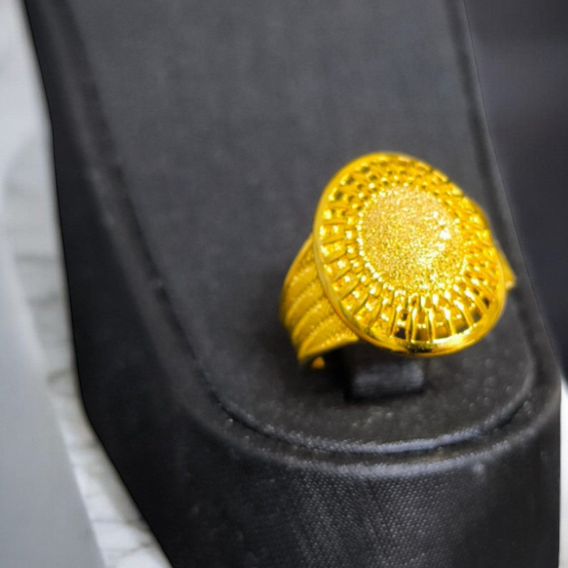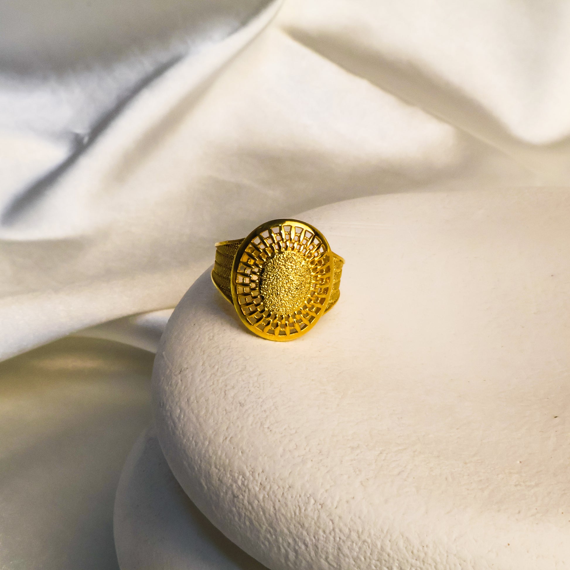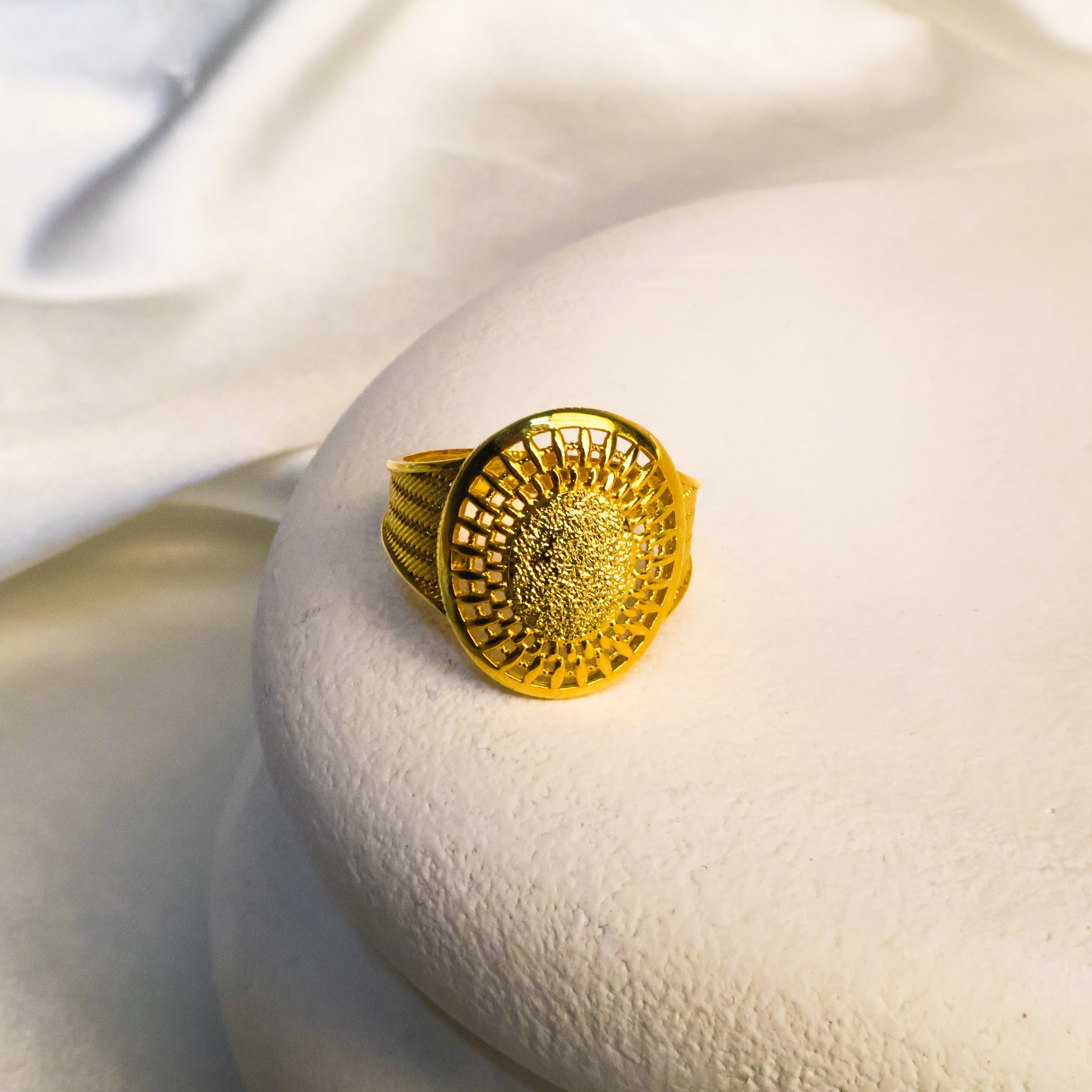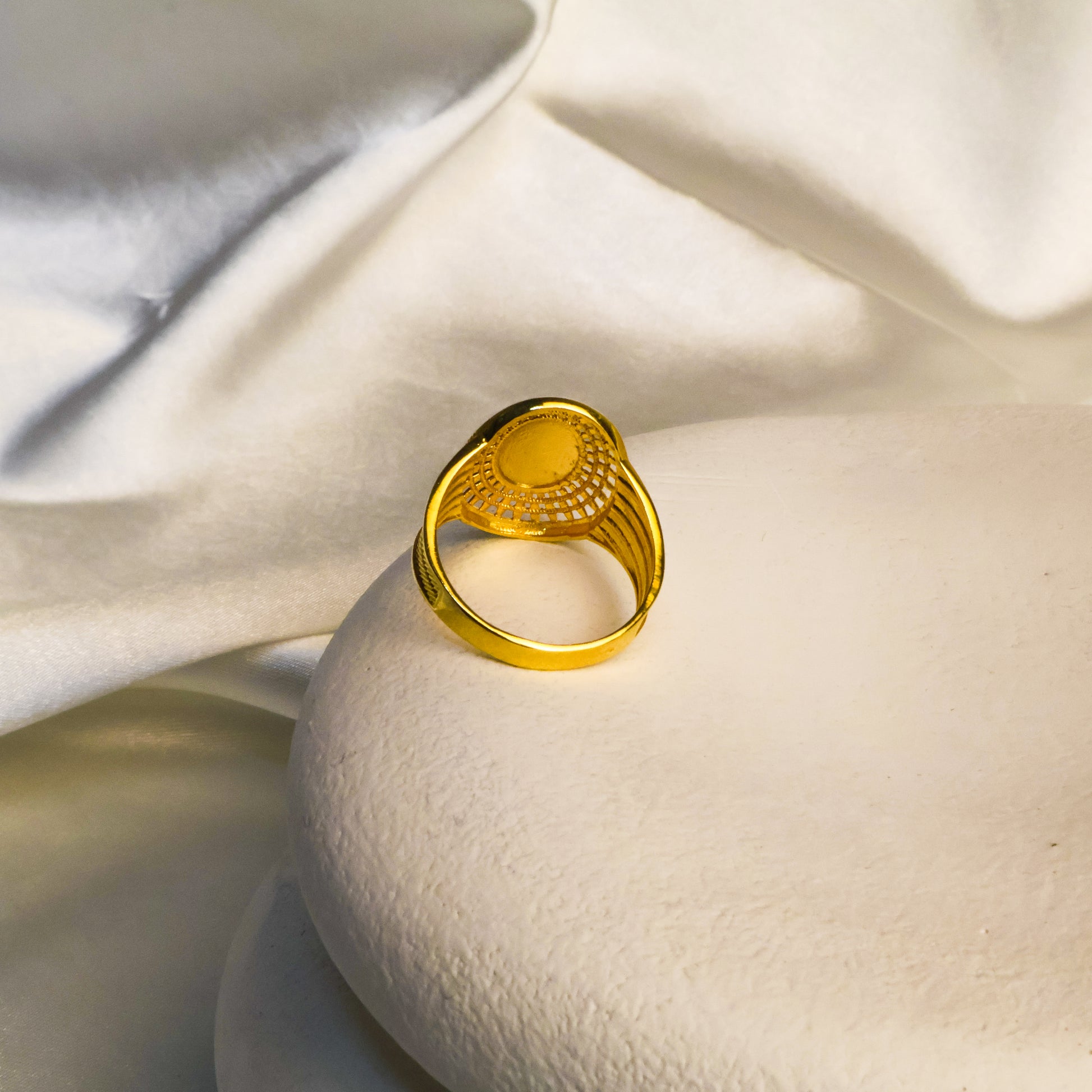 Zarif oval formu ve klasik hasır işçiliğiyle öne çıkan bu yüzük, el işçiliği ve kuyumcu işçiliği ile özenle hazırlanmıştır. Oval tasarım ve hasır detaylar, parmağınıza sofistike bir şıklık katarken, 22 ayar altın kaplama yüzeyi uzun süre parlaklığını korur.