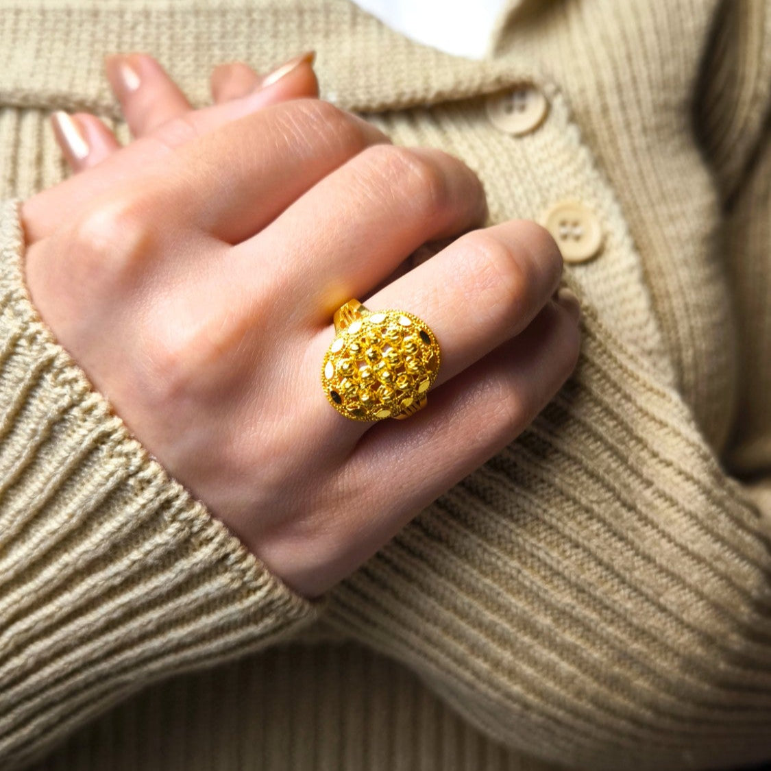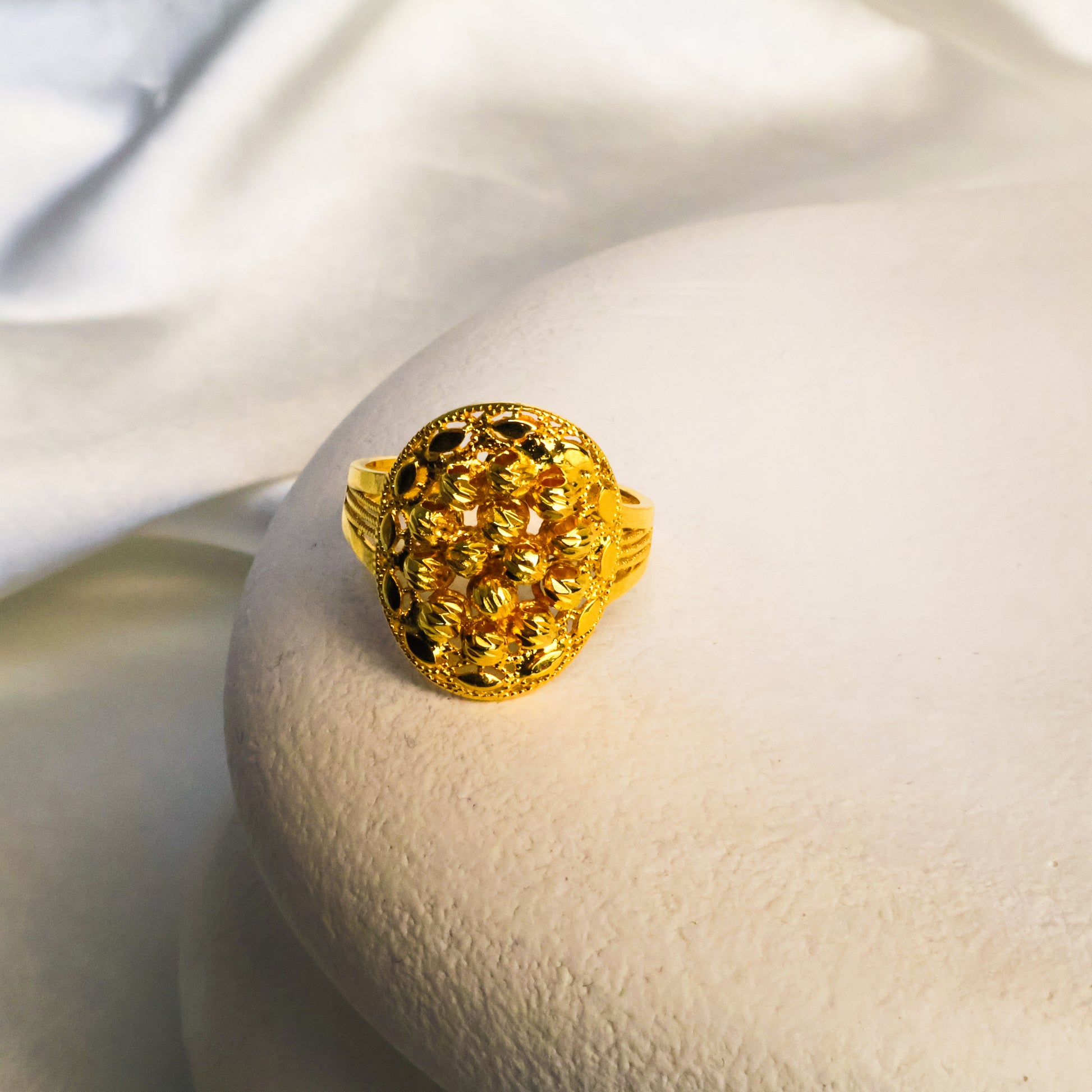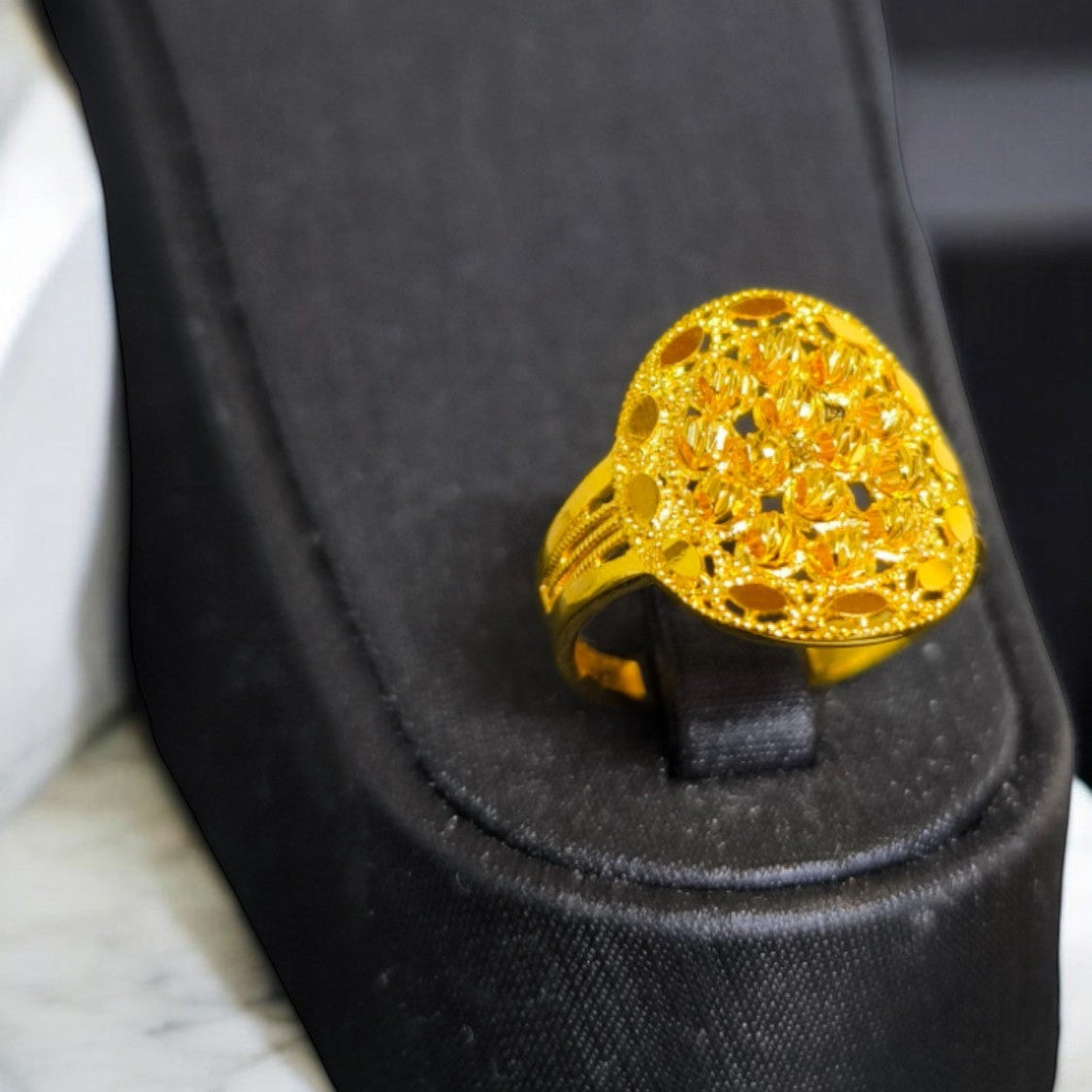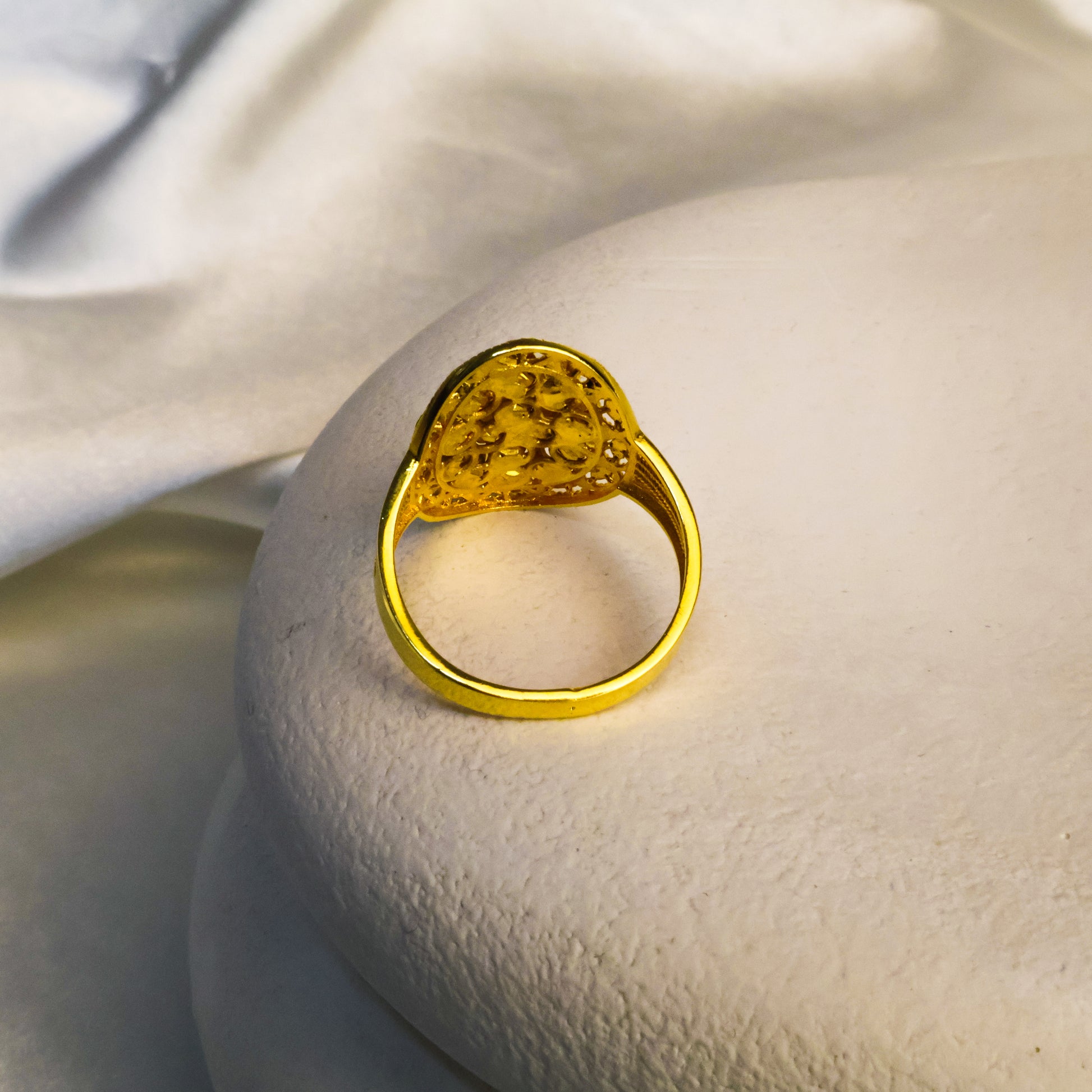 Zarif pullu dorikalı detayları ve oval tasarımıyla öne çıkan bu yüzük, el işçiliği ve kuyumcu işçiliği ile özenle hazırlanmıştır. Pullu dokusu parmağınıza şık bir ışıltı katarken, 22 ayar altın kaplama yüzeyi uzun süre parlaklığını korur.