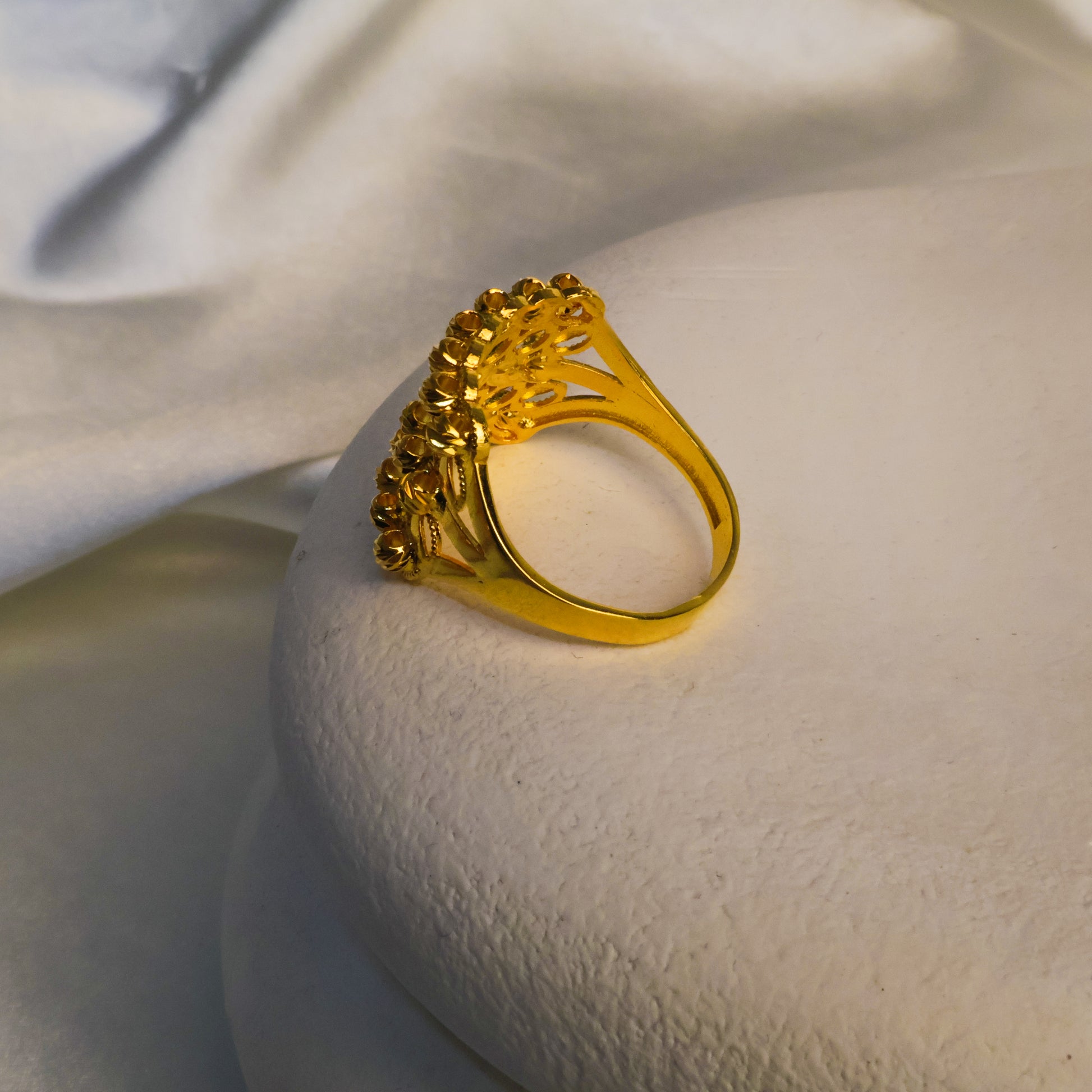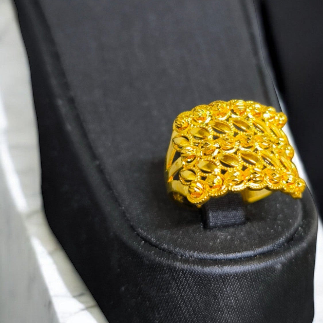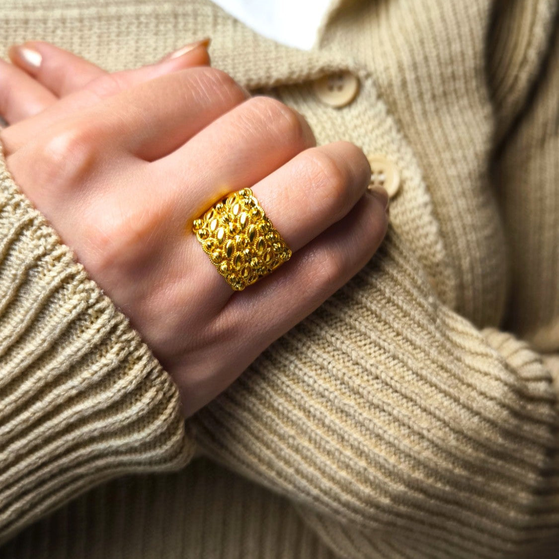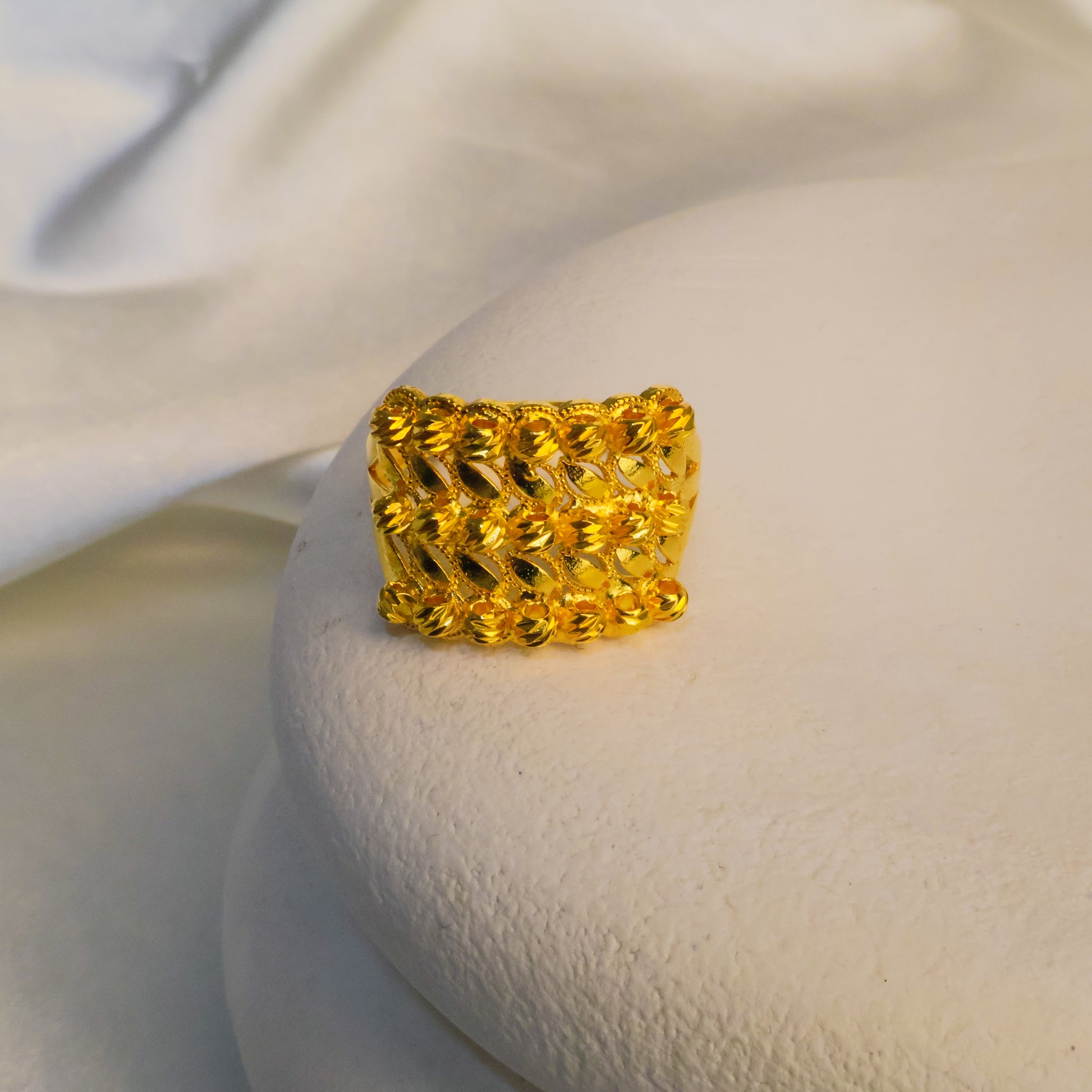Klasik hasır dokusu ve zarif formuyla öne çıkan bu yüzük, el işçiliği ve kuyumcu işçiliği ile özenle hazırlanmıştır. Geleneksel hasır modeli, 22 ayar altın kaplamanın sıcak ışıltısıyla birleşerek her stile uyum sağlayan zamansız bir parça ortaya çıkarır.