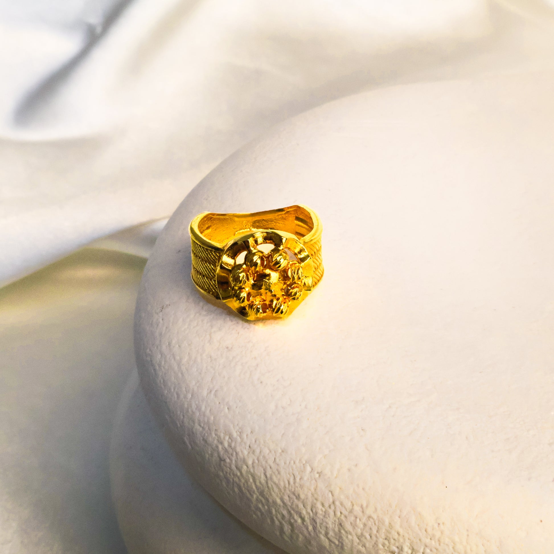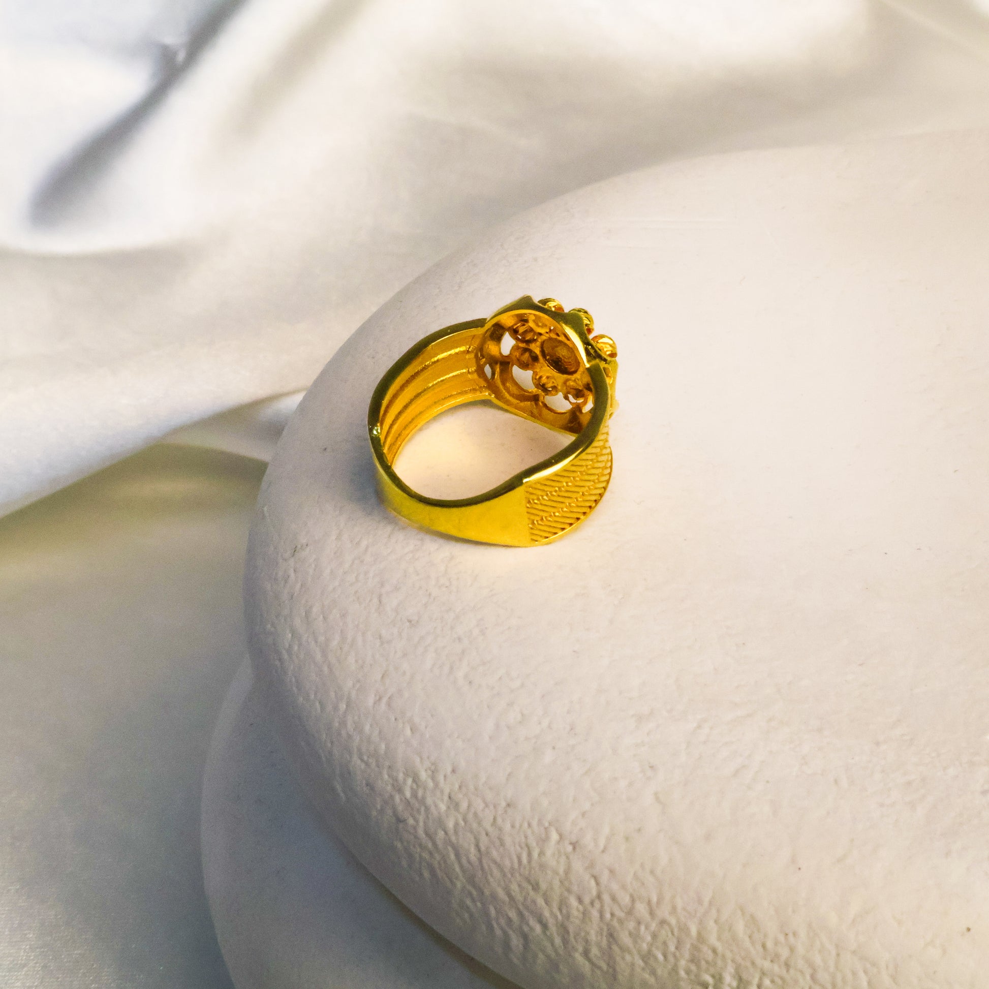 Geleneksel hasır desenini modern detaylarla buluşturan bu yüzük, el işçiliği ve kuyumcu işçiliği ile özenle hazırlanmıştır. Çiçek formundaki çerçevesi ve dorika detaylarıyla zarafeti ön plana çıkarırken, 22 ayar altın kaplama yüzeyi uzun ömürlü parlaklığıyla göz alıcı bir ışıltı sunar.
