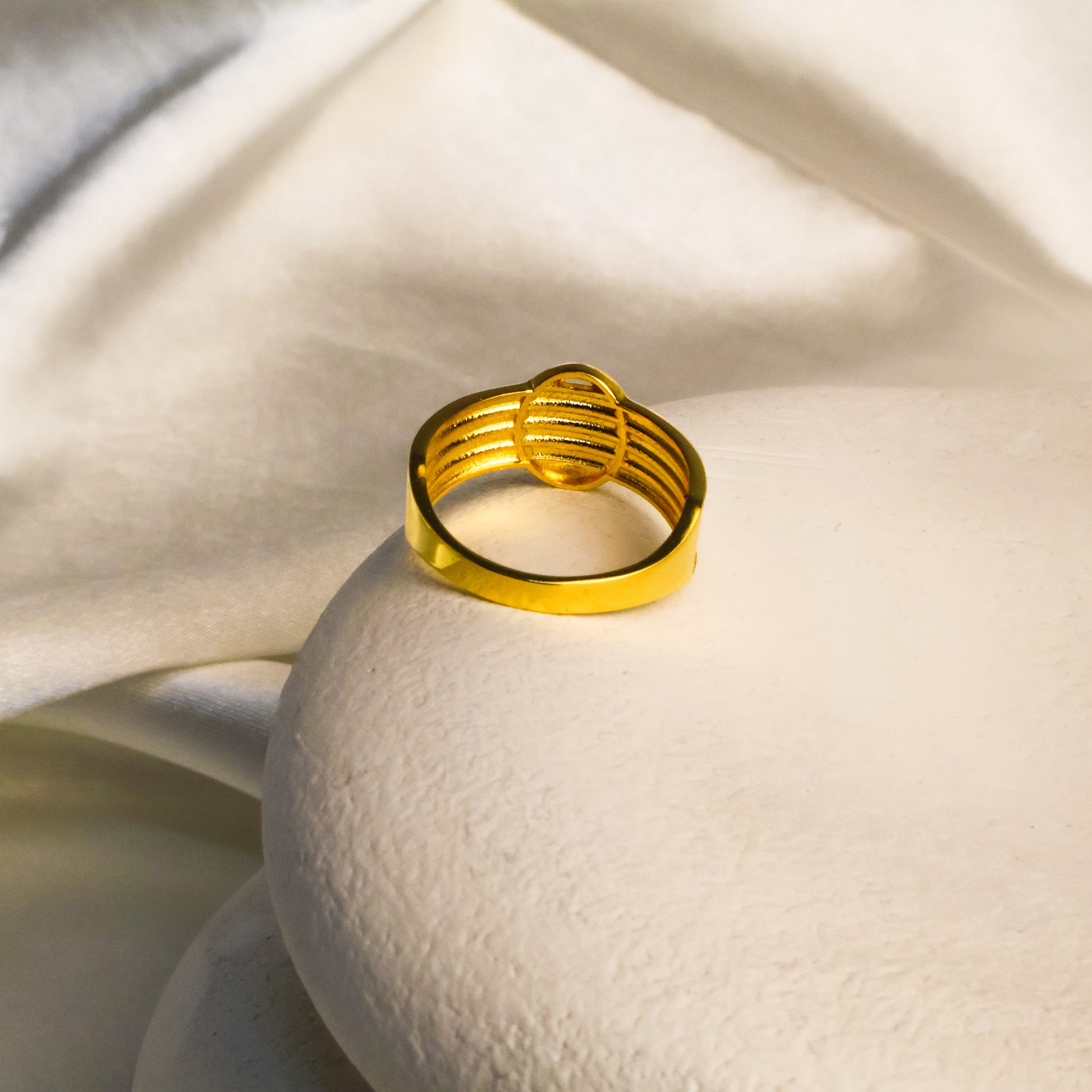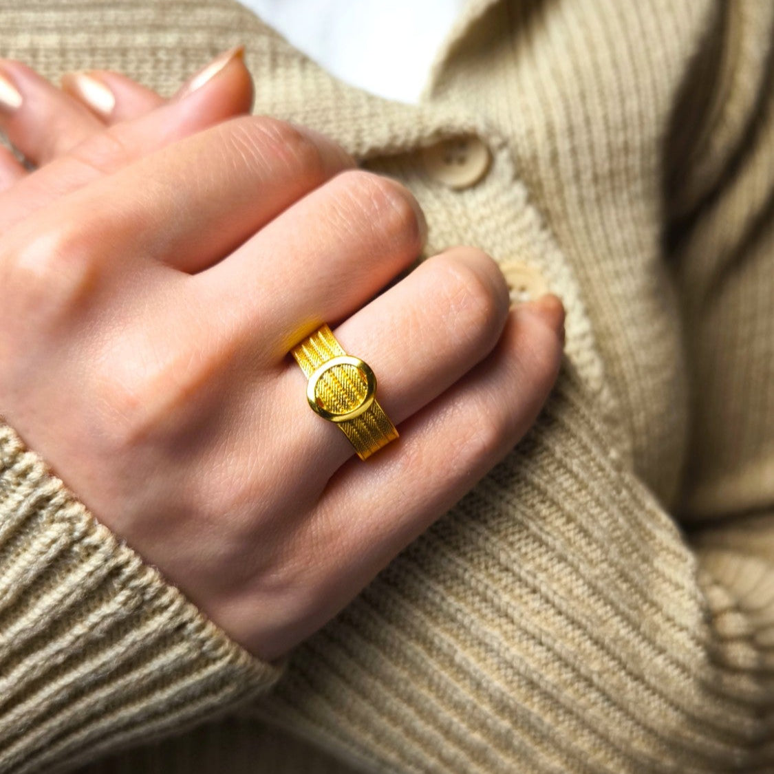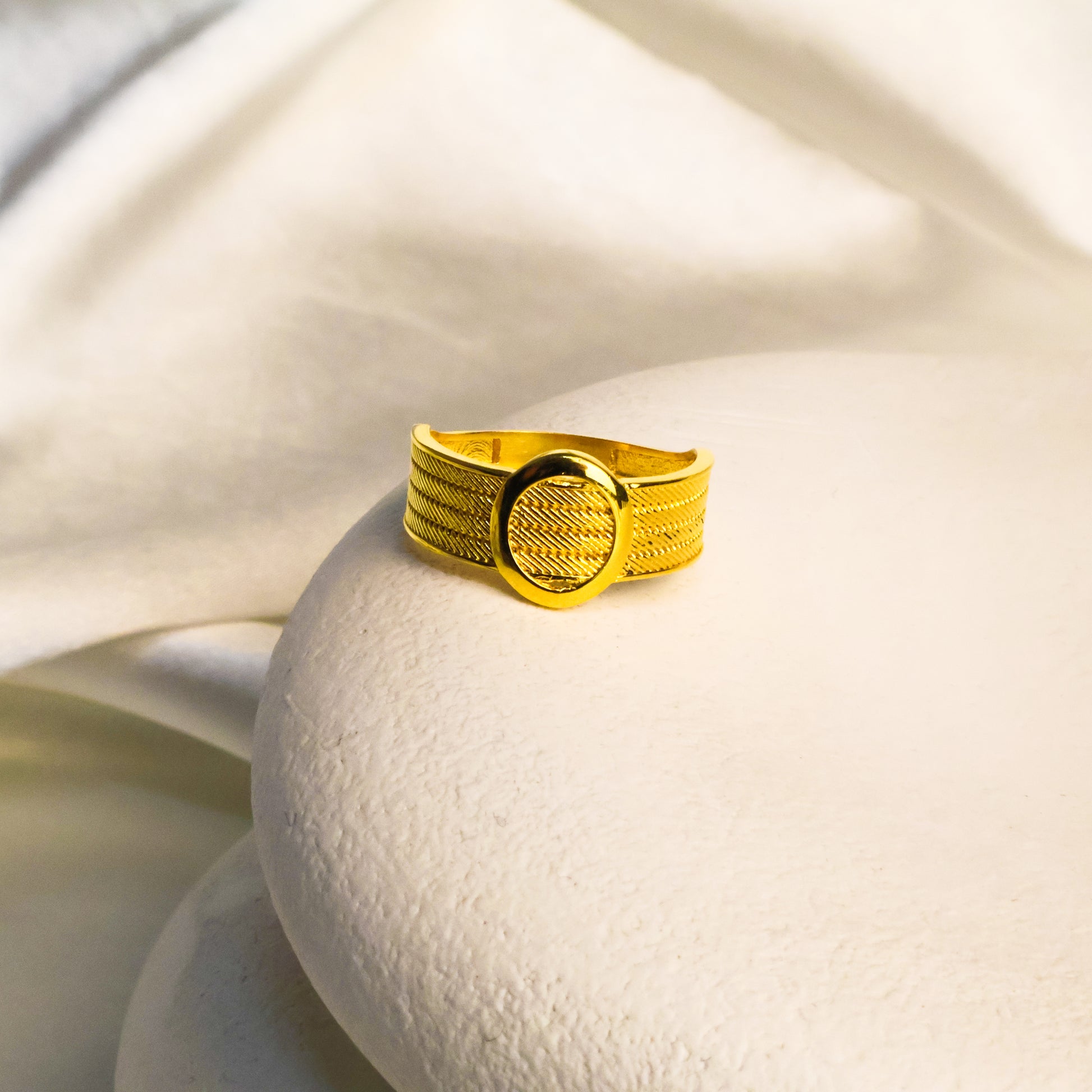 Klasik hasır detayları modern oval formuyla buluşturan bu yüzük, el işçiliği ve kuyumcu işçiliği ile özenle üretilmiştir. 22 ayar altın kaplama yüzeyi uzun süre parlaklığını korur ve her kombine zarif bir dokunuş ekler.