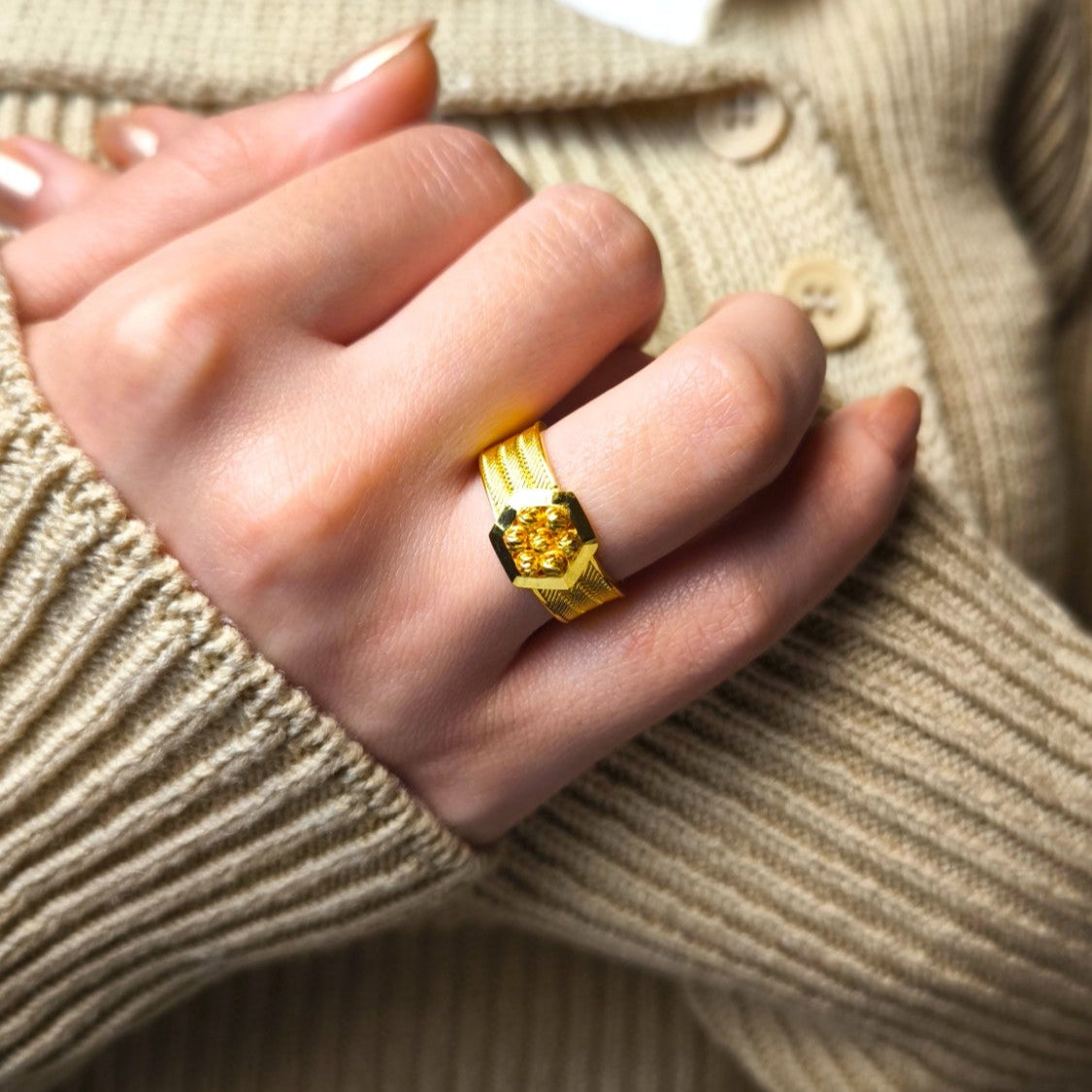 Zarif petek çerçevesiyle doğadan ilham alan bu yüzük, günlük stilinize sofistike bir hava katarken özel günlerde de dikkat çekici bir aksesuar olur.