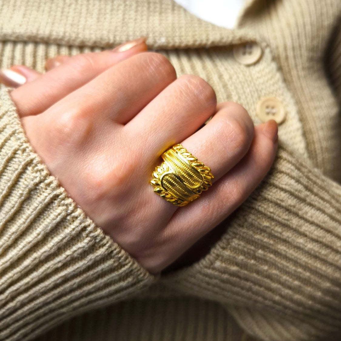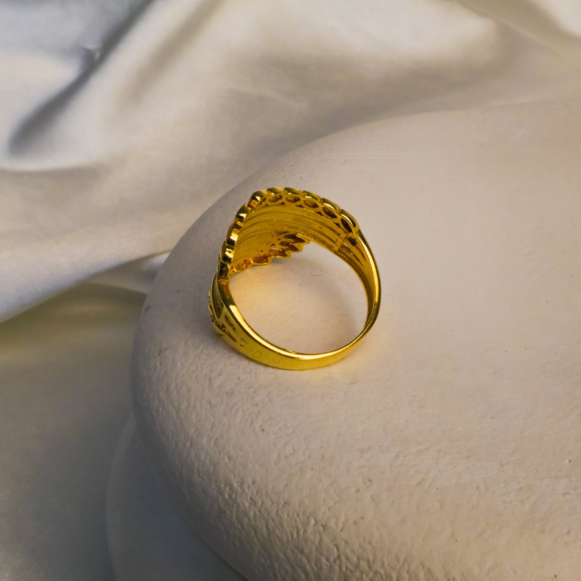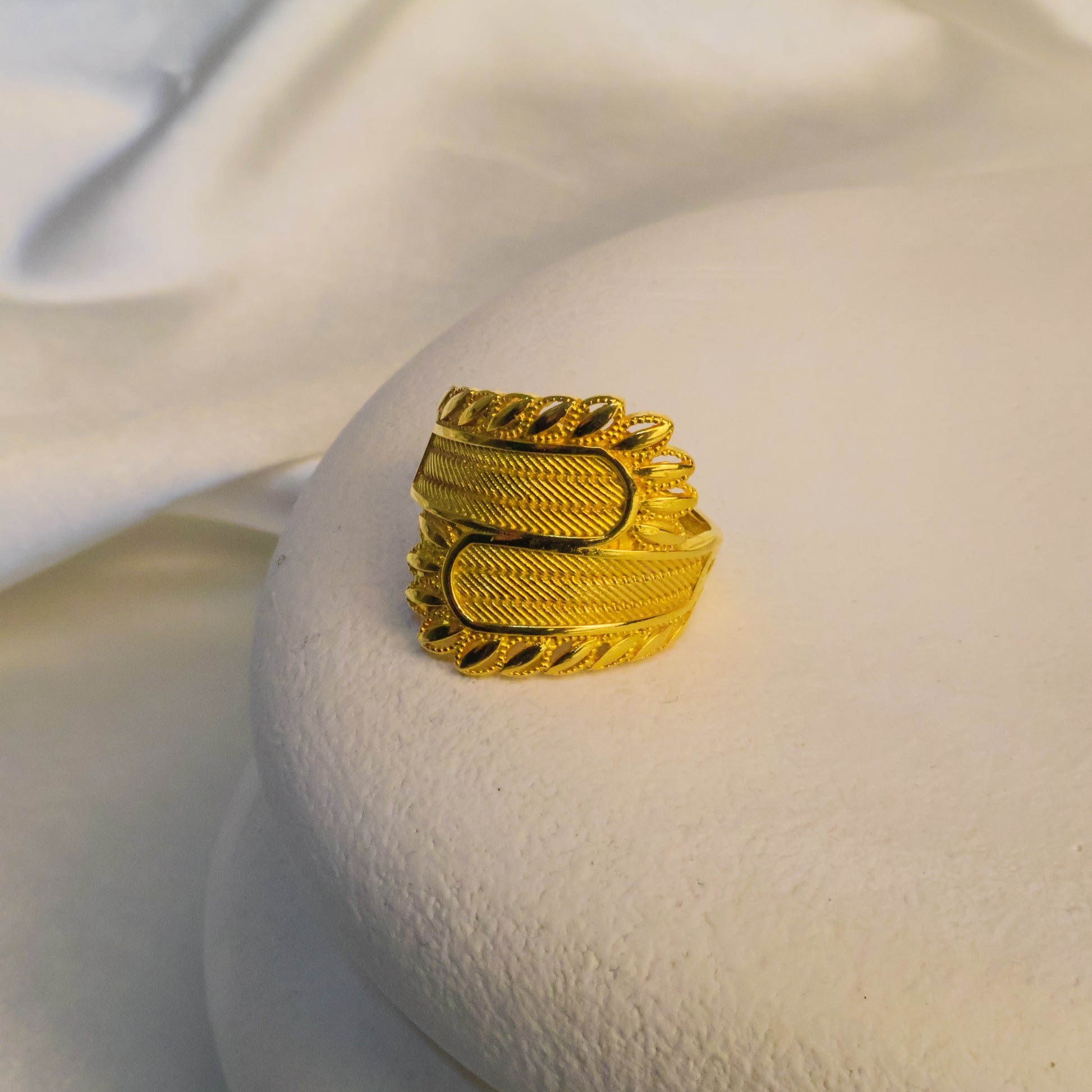 Doğadan ilham alınarak tasarlanan bu zarif yüzük, el işçiliği ve kuyumcu işçiliği ile özenle hazırlanmıştır. Yaprak detayları, klasik hasır dokusuyla buluşarak modern ve sofistike bir görünüm sunar. 22 ayar altın kaplama yüzeyi, uzun süre parlaklığını korur ve zamansız şıklığıyla her stile uyum sağlar.