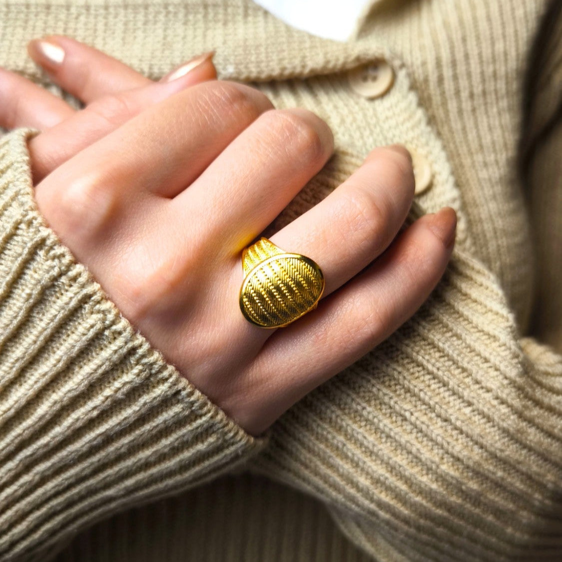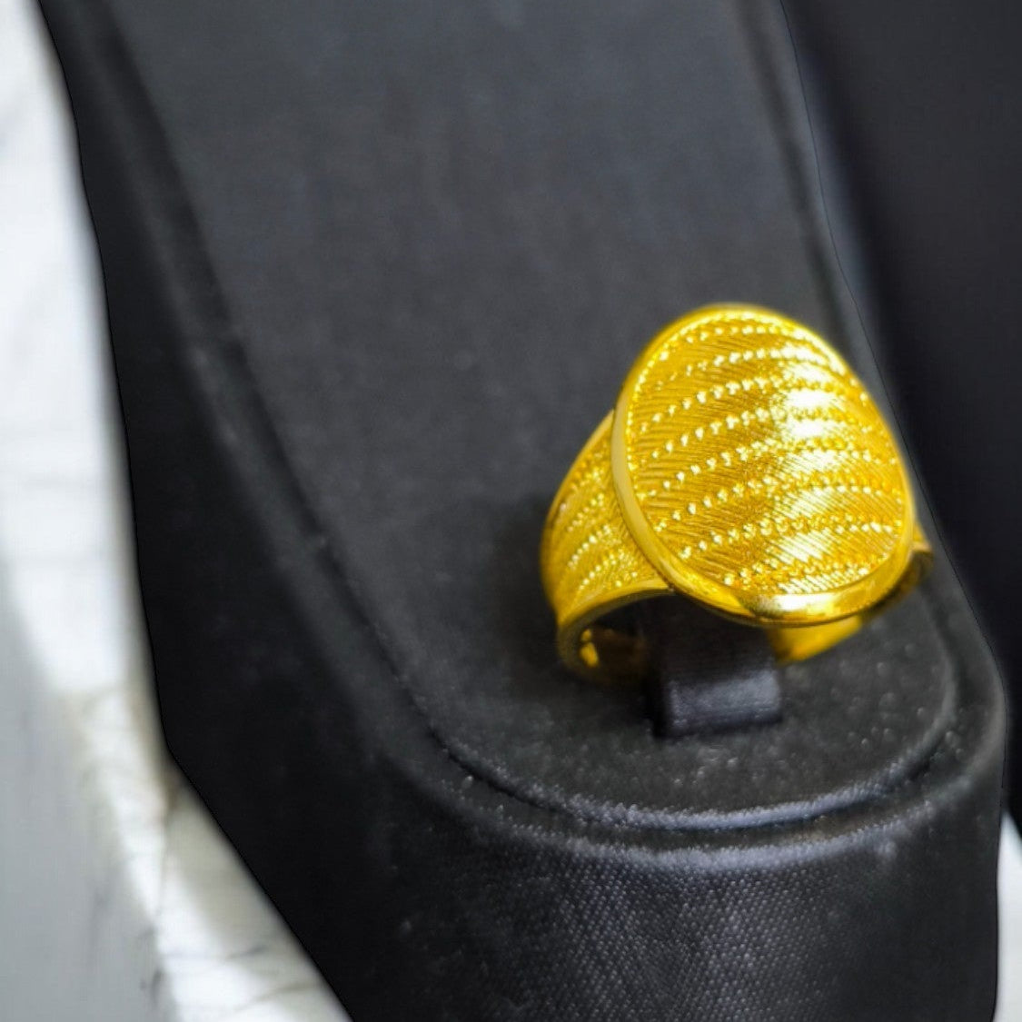 Zarif oval formu ve klasik hasır işçiliğiyle öne çıkan bu yüzük, el işçiliği ve kuyumcu işçiliği ile özenle hazırlanmıştır. Oval tasarım ve hasır detaylar, parmağınıza sofistike bir şıklık katarken, 22 ayar altın kaplama yüzeyi uzun süre parlaklığını korur.