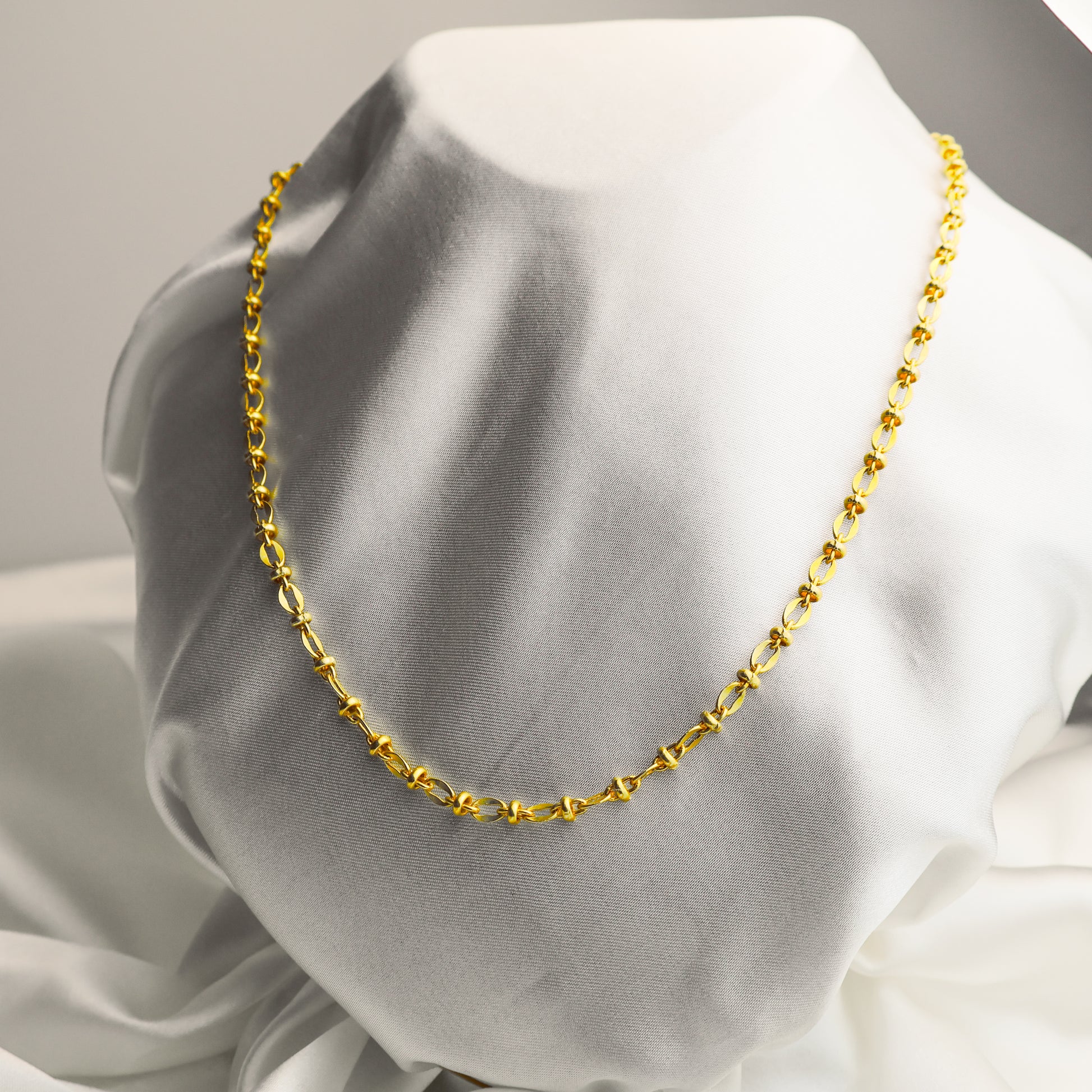 22 Ayar Altın Kaplama Yıldız Zincir, çok yüzeyli özel kesimi sayesinde ışığı her açıdan yansıtarak boyunda parlak ve dikkat çekici bir görünüm sunan klasik bir zincir modelidir. Zincirin her halkasında yer alan keskin ve net yüzeyler, hareket ettikçe “yıldız ışıltısı” etkisi oluşturur. Bu yapısı sayesinde günlük kullanımda sade bir şıklık, özel günlerde ise göz alıcı bir parlaklık sağlar.