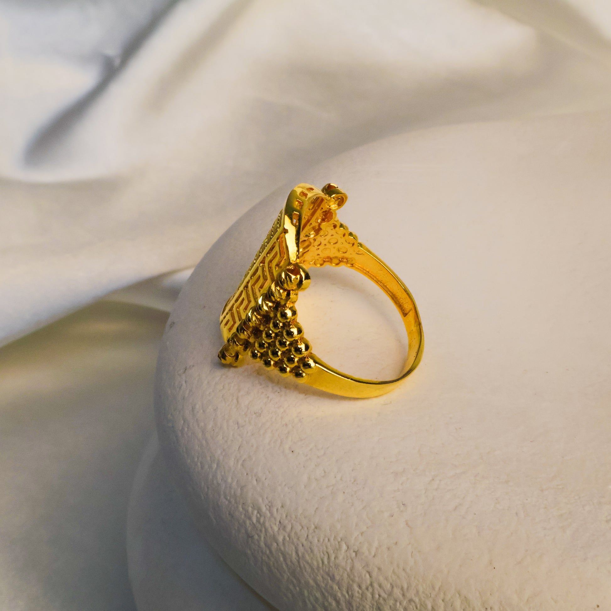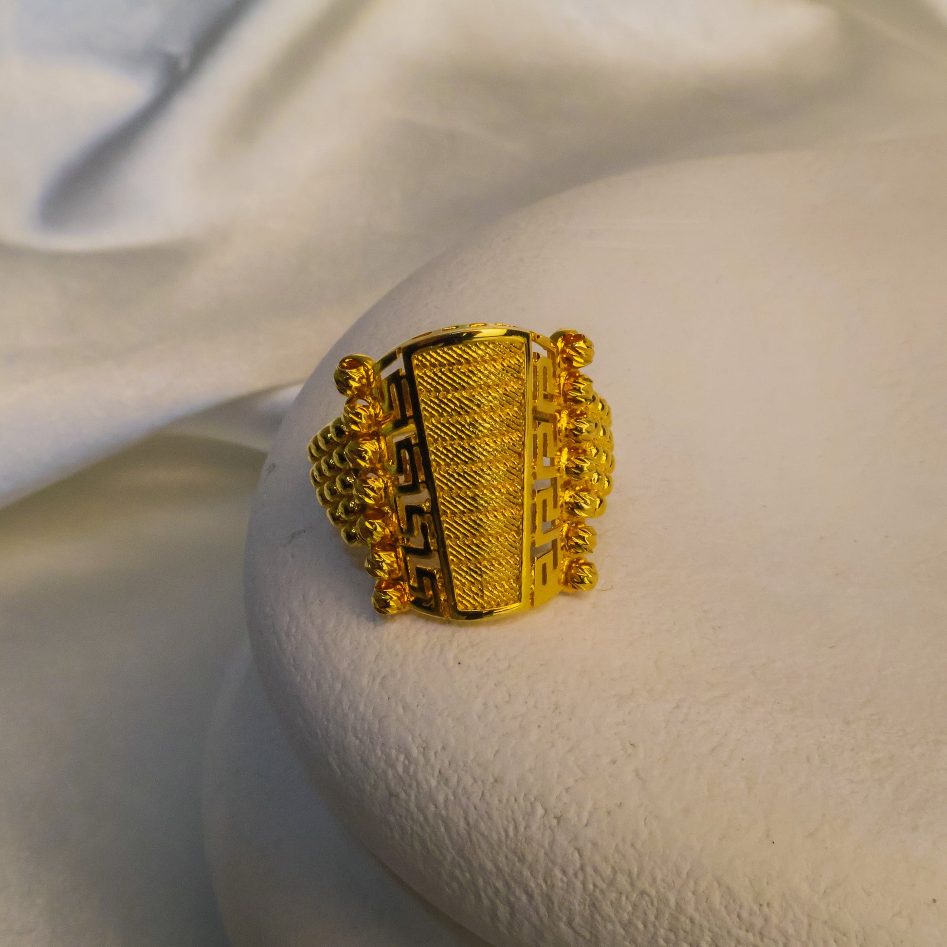Klasik hasır dokusu ve zarif formuyla öne çıkan bu yüzük, el işçiliği ve kuyumcu işçiliği ile özenle hazırlanmıştır. Geleneksel hasır modeli, 22 ayar altın kaplamanın sıcak ışıltısıyla birleşerek her stile uyum sağlayan zamansız bir parça ortaya çıkarır.