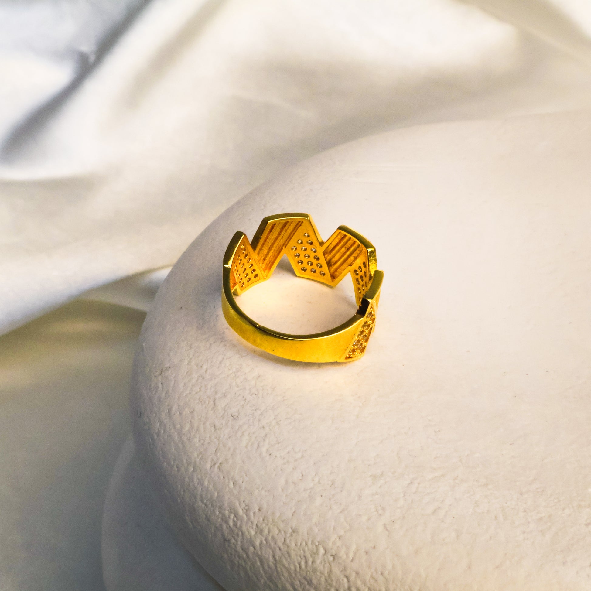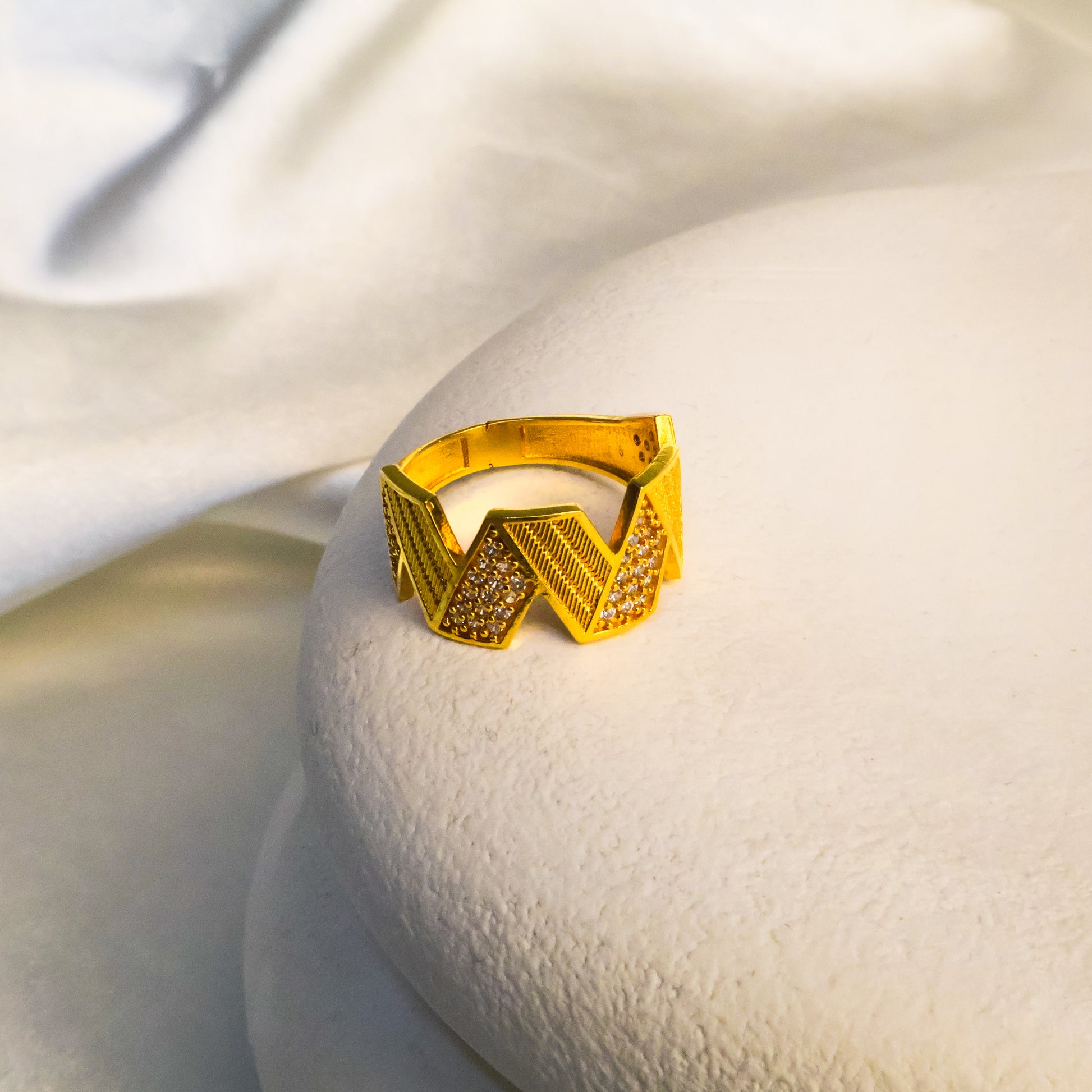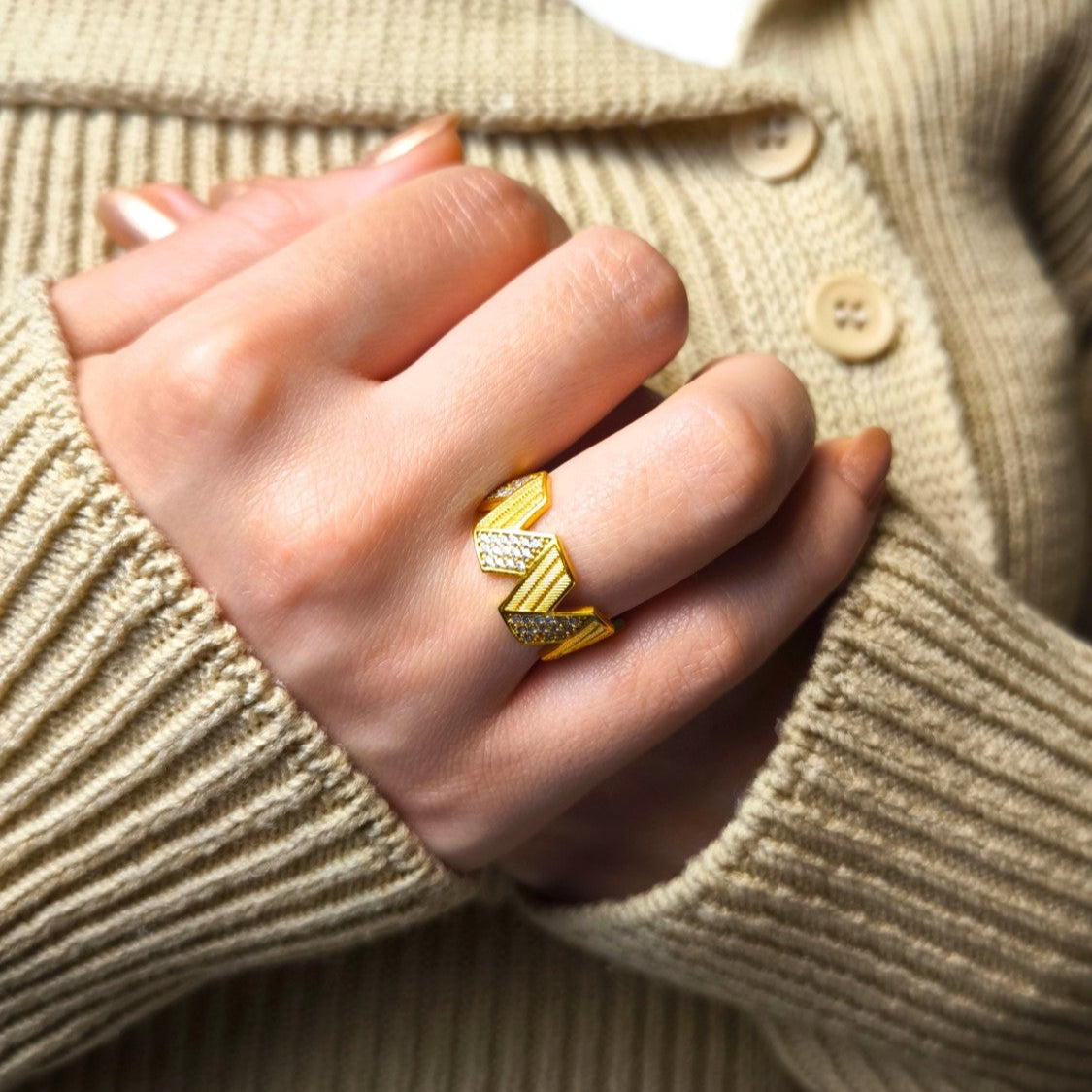 Modern çizgileri ve göz alıcı zirkon taş detaylarıyla öne çıkan bu yüzük, el işçiliği ve kuyumcu işçiliği ile özenle hazırlanmıştır. Zigzag formundaki hasır gövde, parmağınıza şık ve zarif bir hareket katar. 22 ayar altın kaplama yüzeyi uzun süre parlaklığını korur.