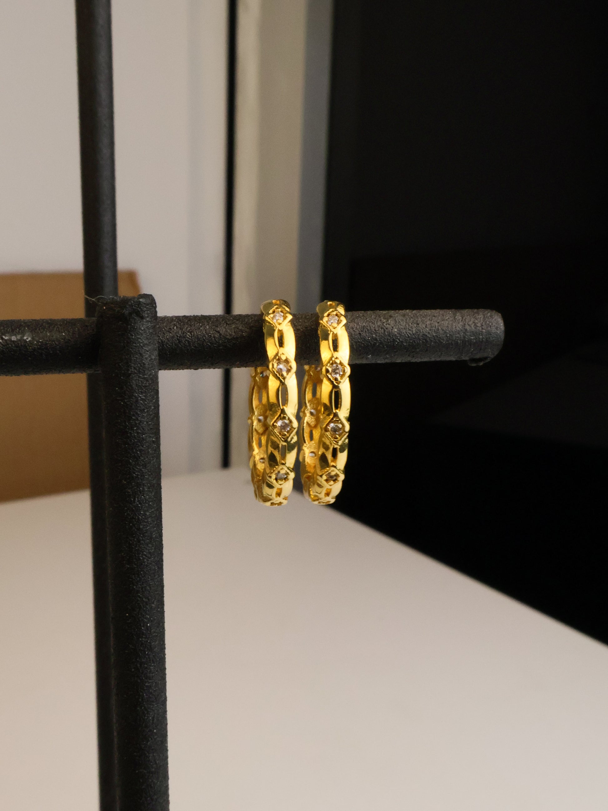 Bu zirkon taşlı halka küpe, 22 ayar altın kaplama ve el işçiliği ile özenle tasarlanmıştır. Parlak zirkon taşları, hem günlük kullanımda hem de özel günlerde stilinize ışıltılı bir dokunuş katar.