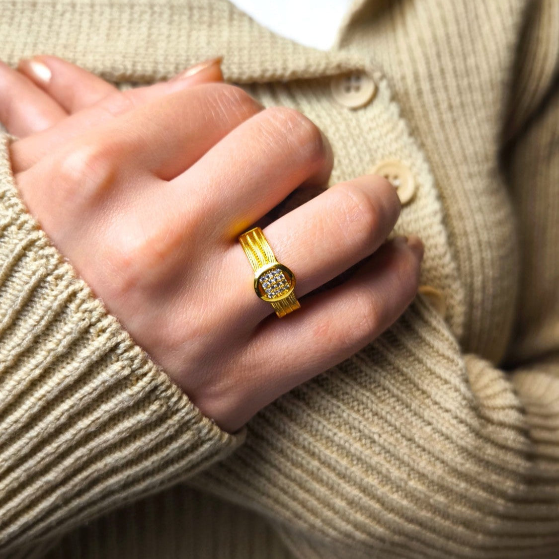 El işçiliğiyle hazırlanmış bu özel tasarım oval hasır yüzük, kuyumcu işçiliğinin zarafetini modern detaylarla buluşturuyor. 22 ayar altın kaplama yüzeyi, uzun ömürlü parlaklığıyla göz alıcı bir şıklık sunarken, ortasında yer alan zirkon taş ışıltısıyla tasarımı tamamlıyor.